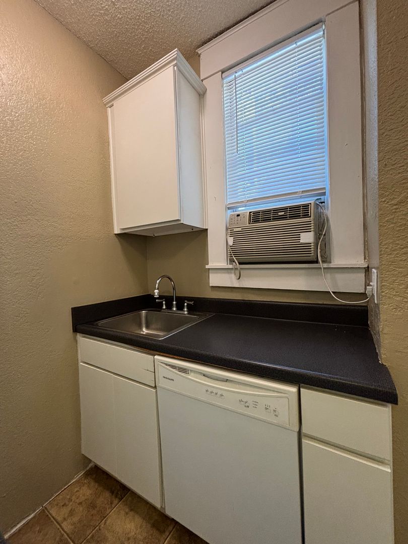 The kitchen has tall white cabinetry and everything you need including a dishwasher!