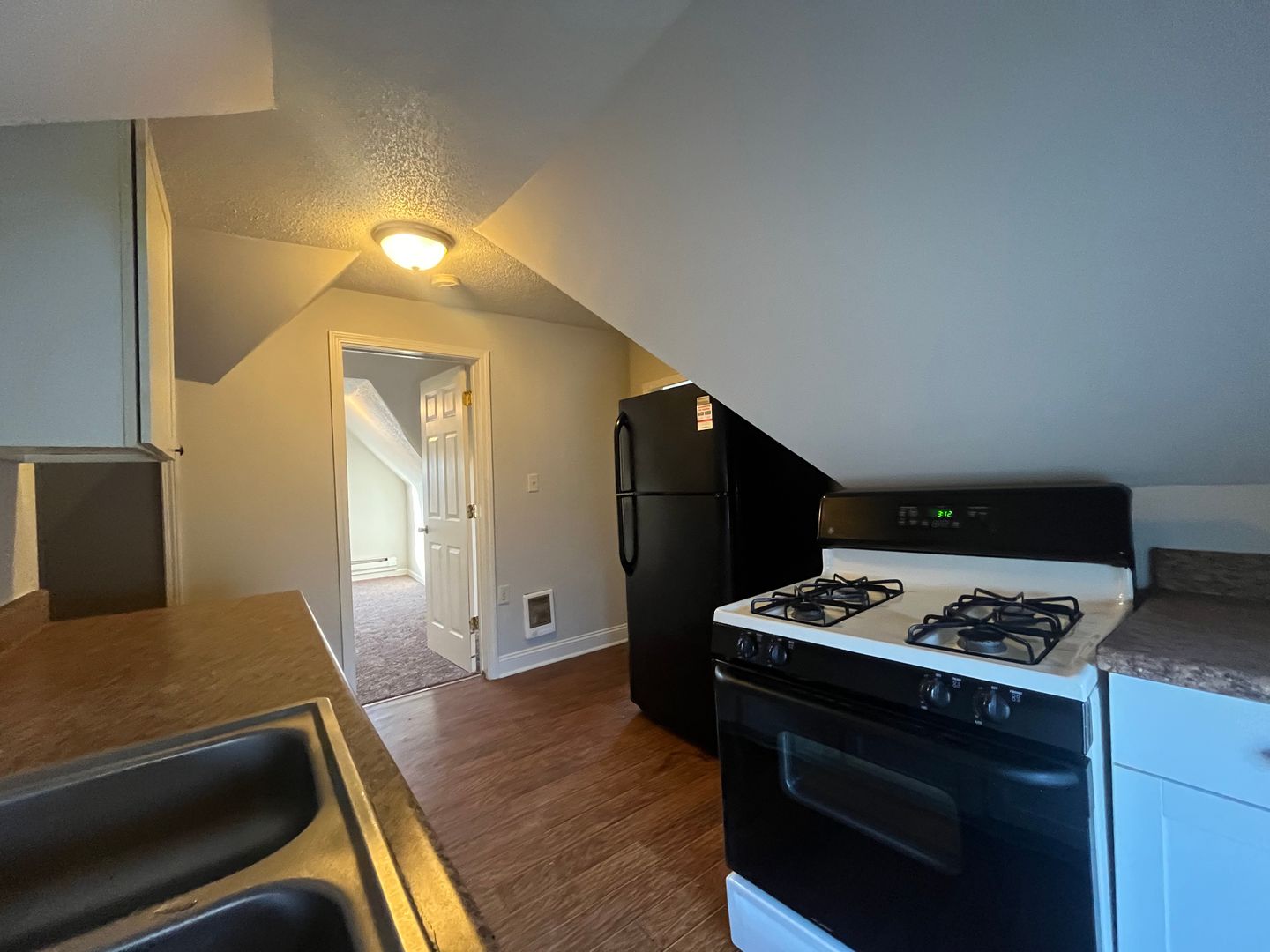 The kitchen features a gas stove and solid cabinet space, making it functional for everyday cooking. The tiled bathroom provides a clean and practical setup. Elevated ceiling lines, interesting angles, and the overall top-floor feel make the space stand out from a typical apartment. Available now, this upper-level unit offers a cozy and distinctive living experience in a conveniently located East Side building.