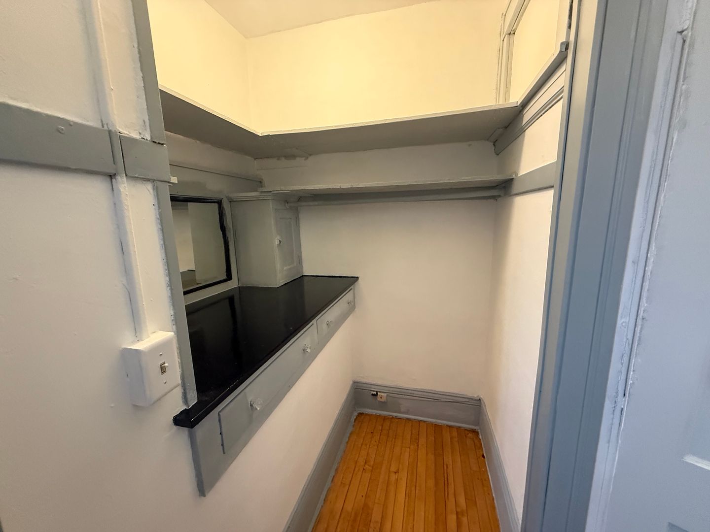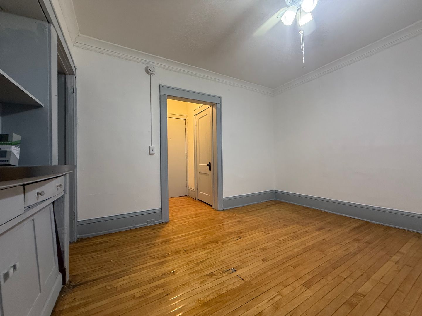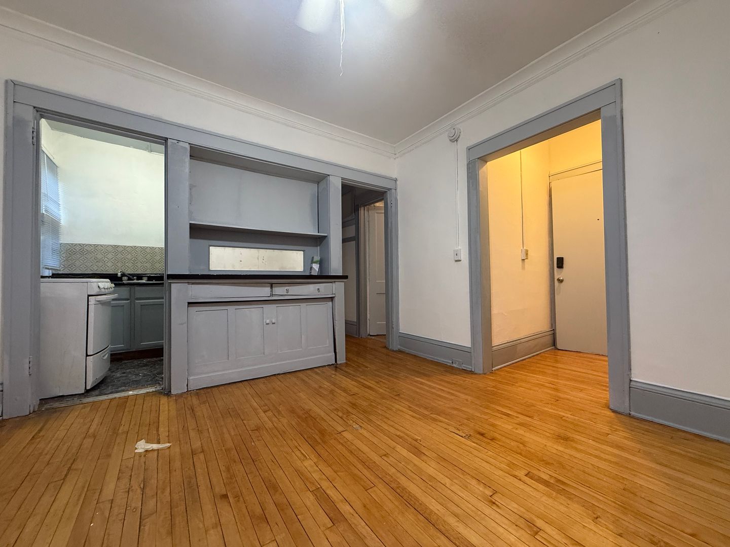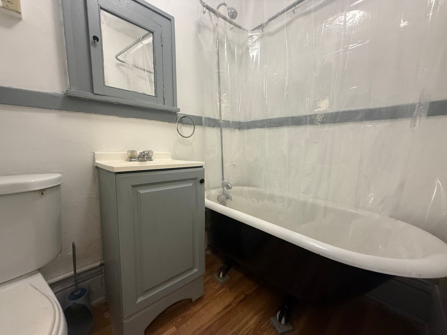 This inviting studio blends historic charm with modern updates, featuring original hardwood floors, fresh paint, and large windows that fill the space with natural light. The open layout flows into a functional kitchen with updated cabinetry, a gas range, and ample counter space. The bathroom includes a classic clawfoot tub and timeless tile accents. Shared on-site laundry adds everyday convenience.