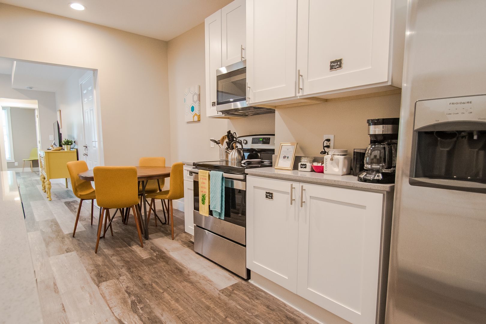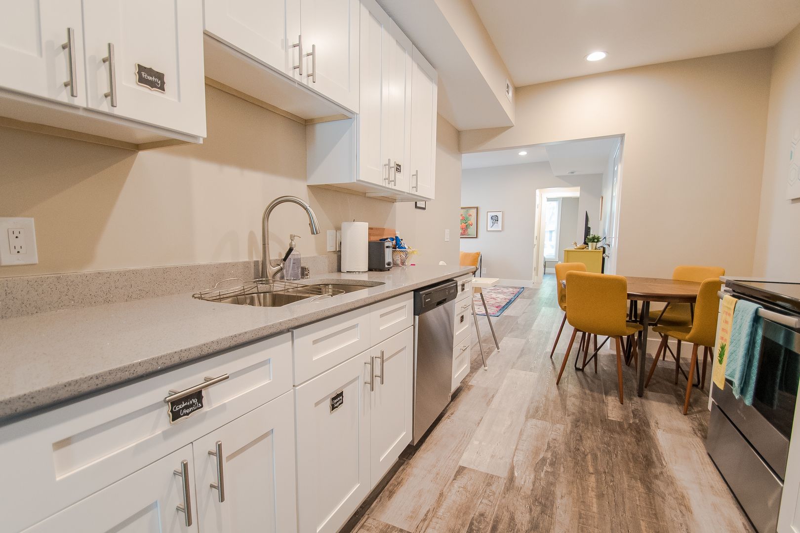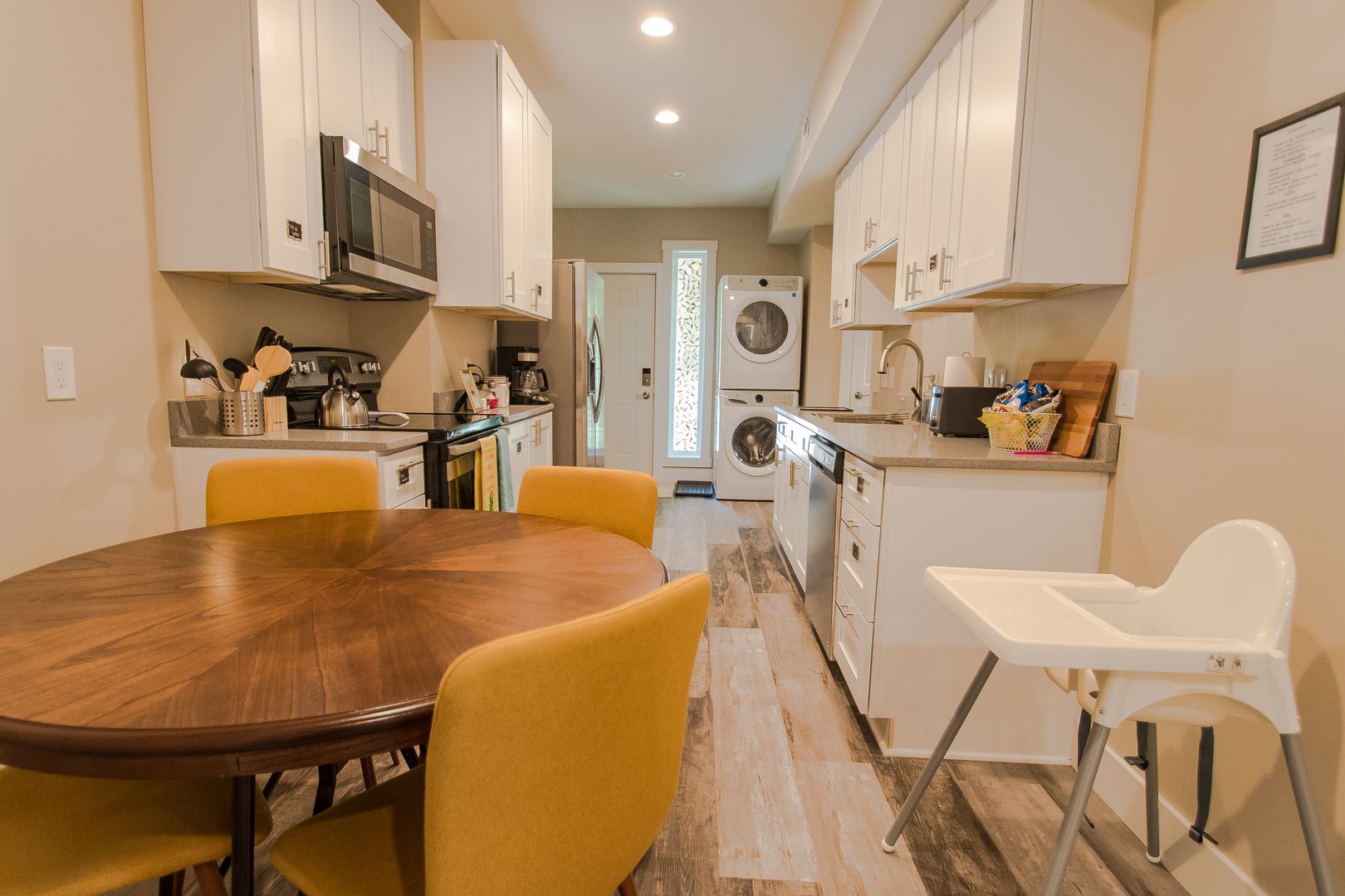 The gourmet-style kitchen features gleaming white cabinets with stainless appliances, generous countertop space, and well as consistent woodgrain plank flooring.
