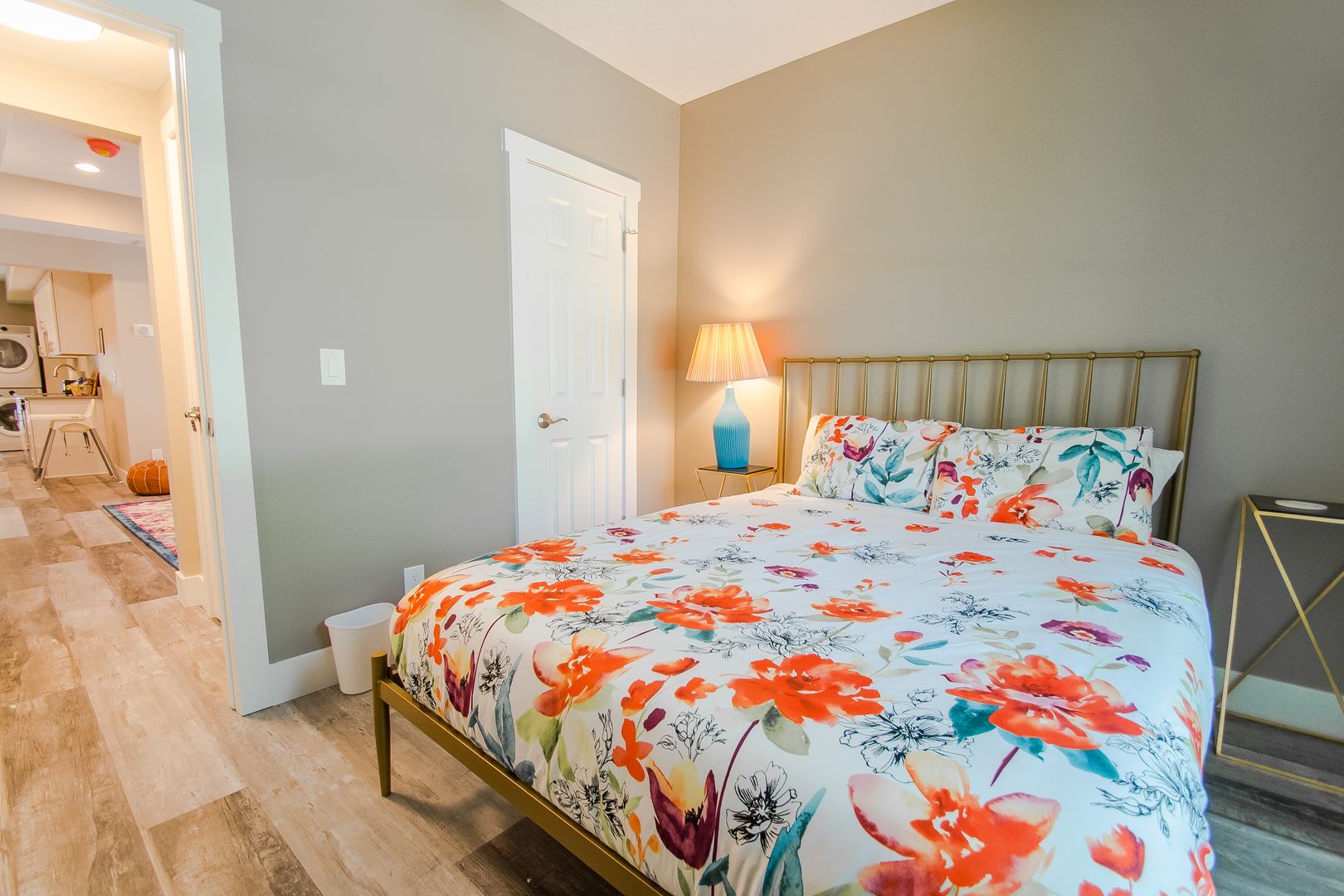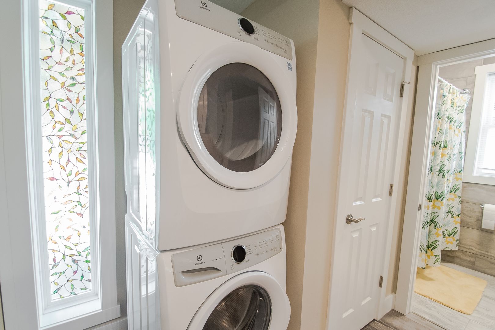 The bathroom features a deep whirlpool tub that is surrounded by gorgeous tile on the floor, as well as on some of the walls. A full size washer and dryer is cleverly nestled in their own closet right outside the bathroom.