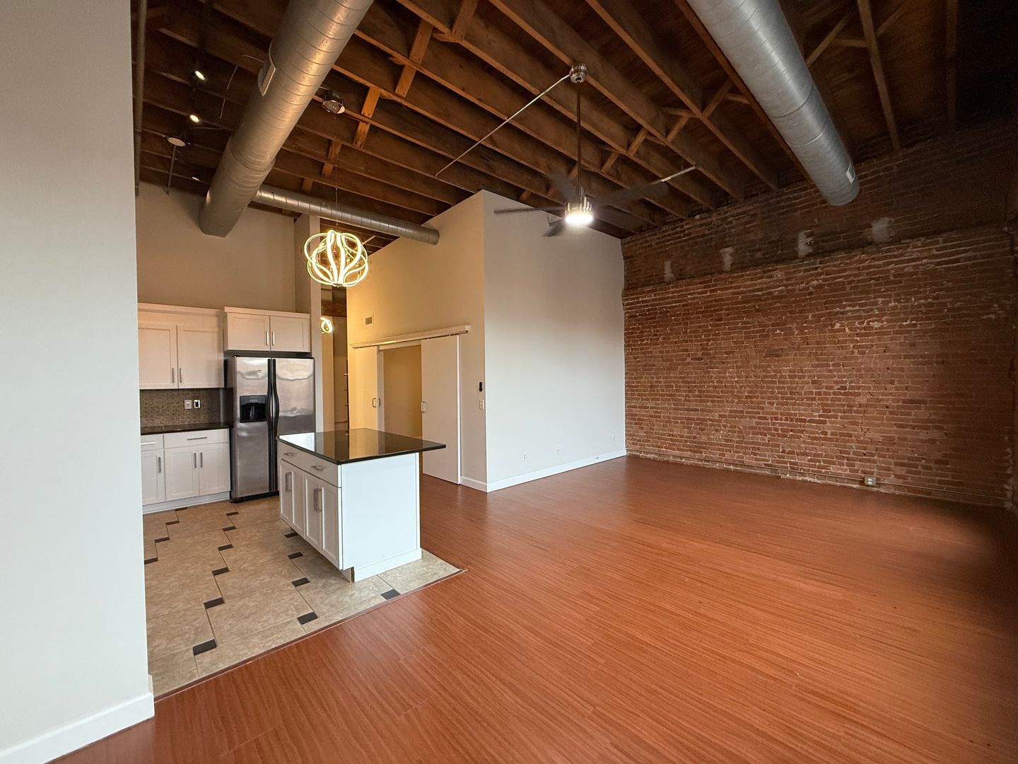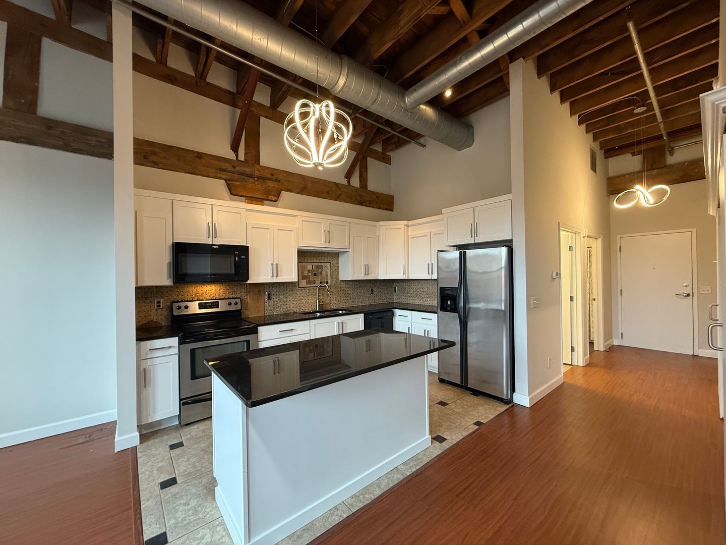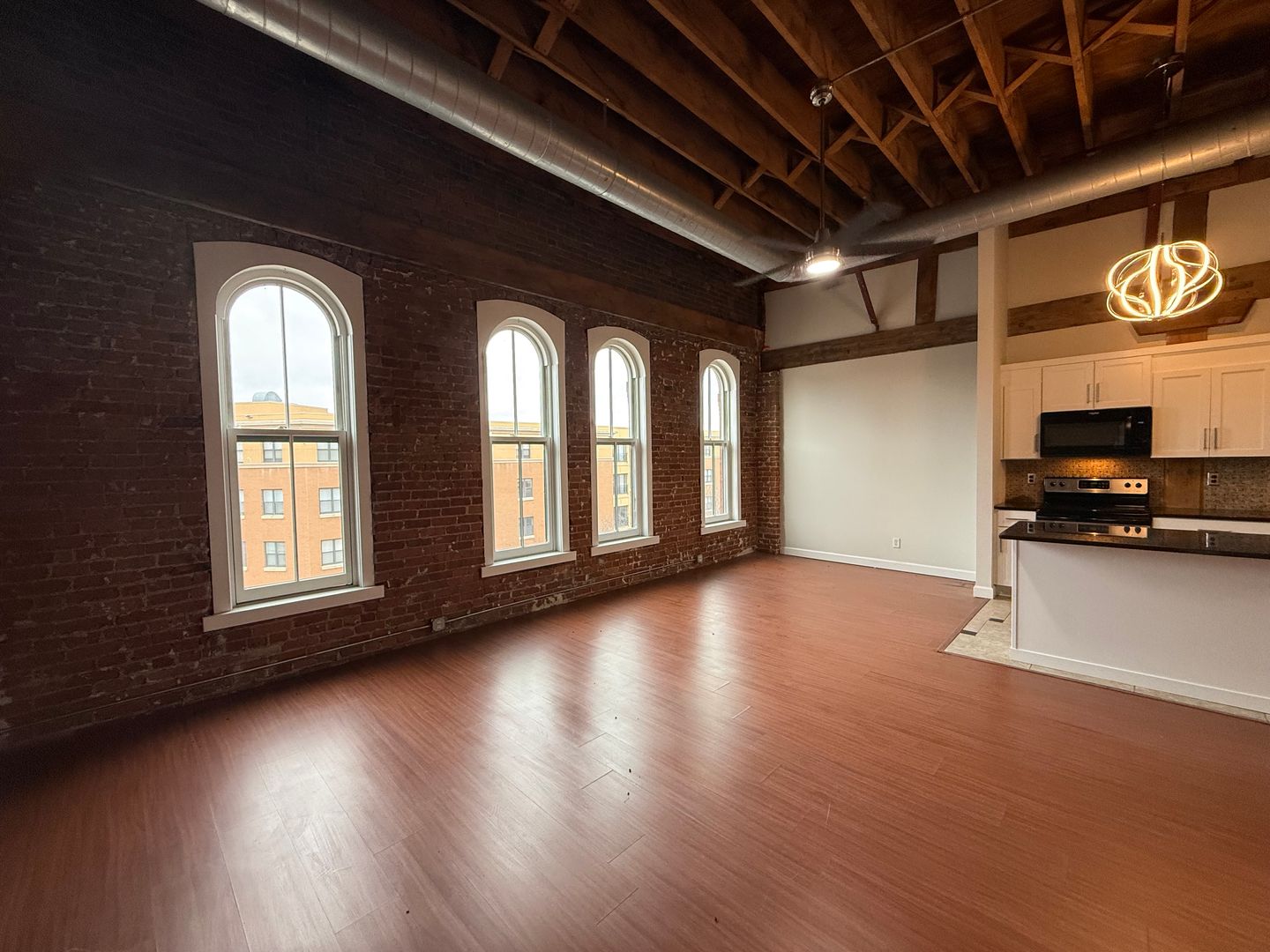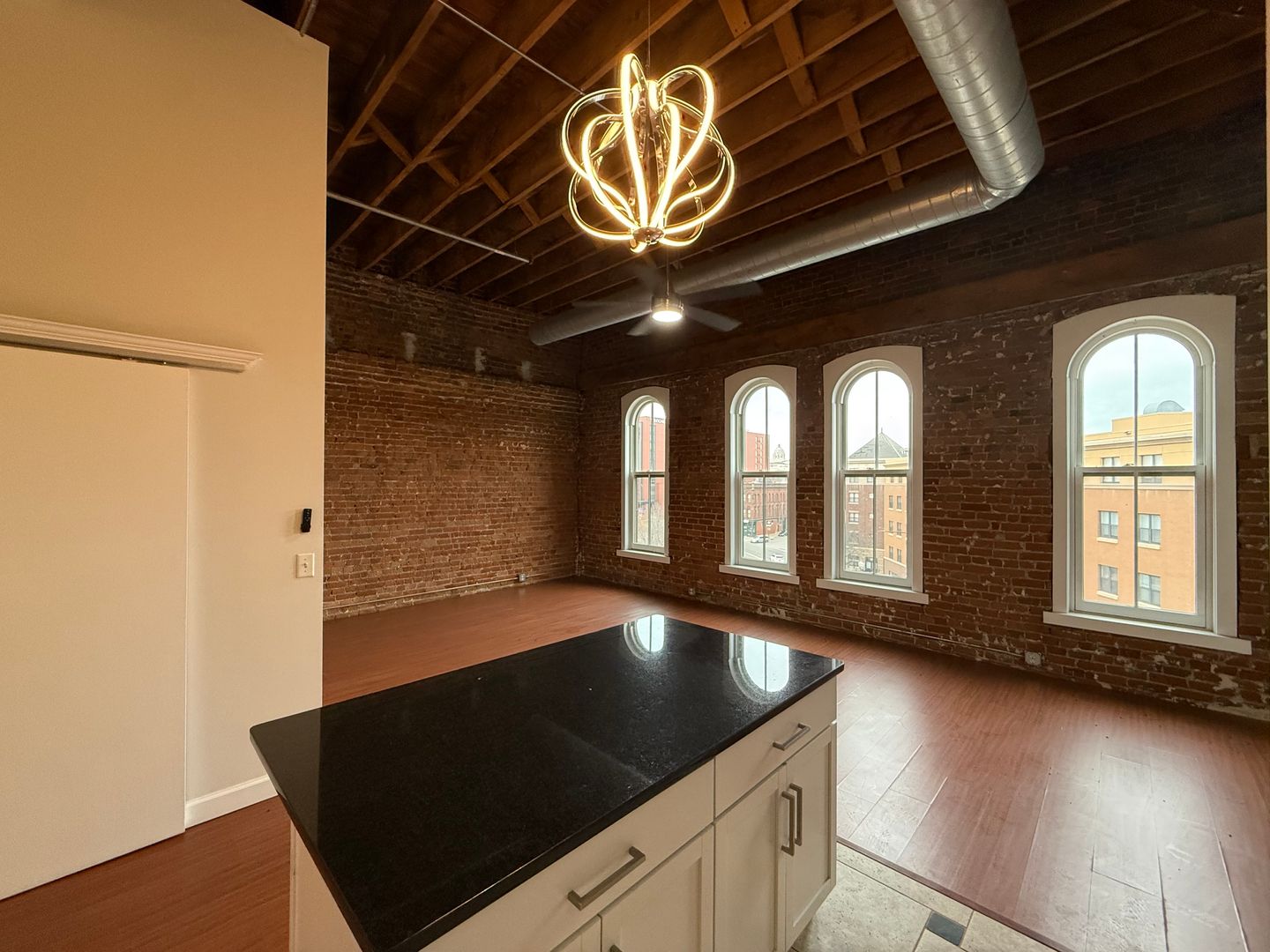 This 4th-floor apartment features an expansive open floor plan with tall ceilings, oversized windows, and beautiful exposed brick walls that bring in historic charm. The large kitchen includes granite countertops, a full tile backsplash, stainless steel appliances, a dishwasher, and a spacious center island perfect for cooking or entertaining. Tiled flooring in both the kitchen and bathroom provides a clean, modern finish, while chandeliers, barn doors, and remote-controlled ceiling fans and lighting add thoughtful style throughout. The generous living room offers plenty of space, and the versatile bonus area can be used as an office, dining room, or oversized mud room depending on your needs. With elevator access and an updated layout designed for comfort and functionality, this home delivers an exceptional downtown living experience close to restaurants, transit, and entertainment.