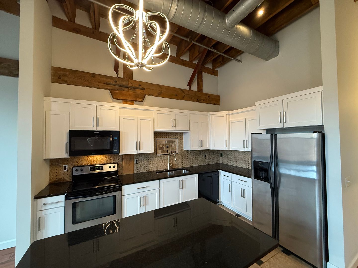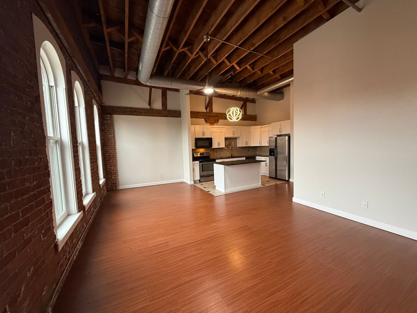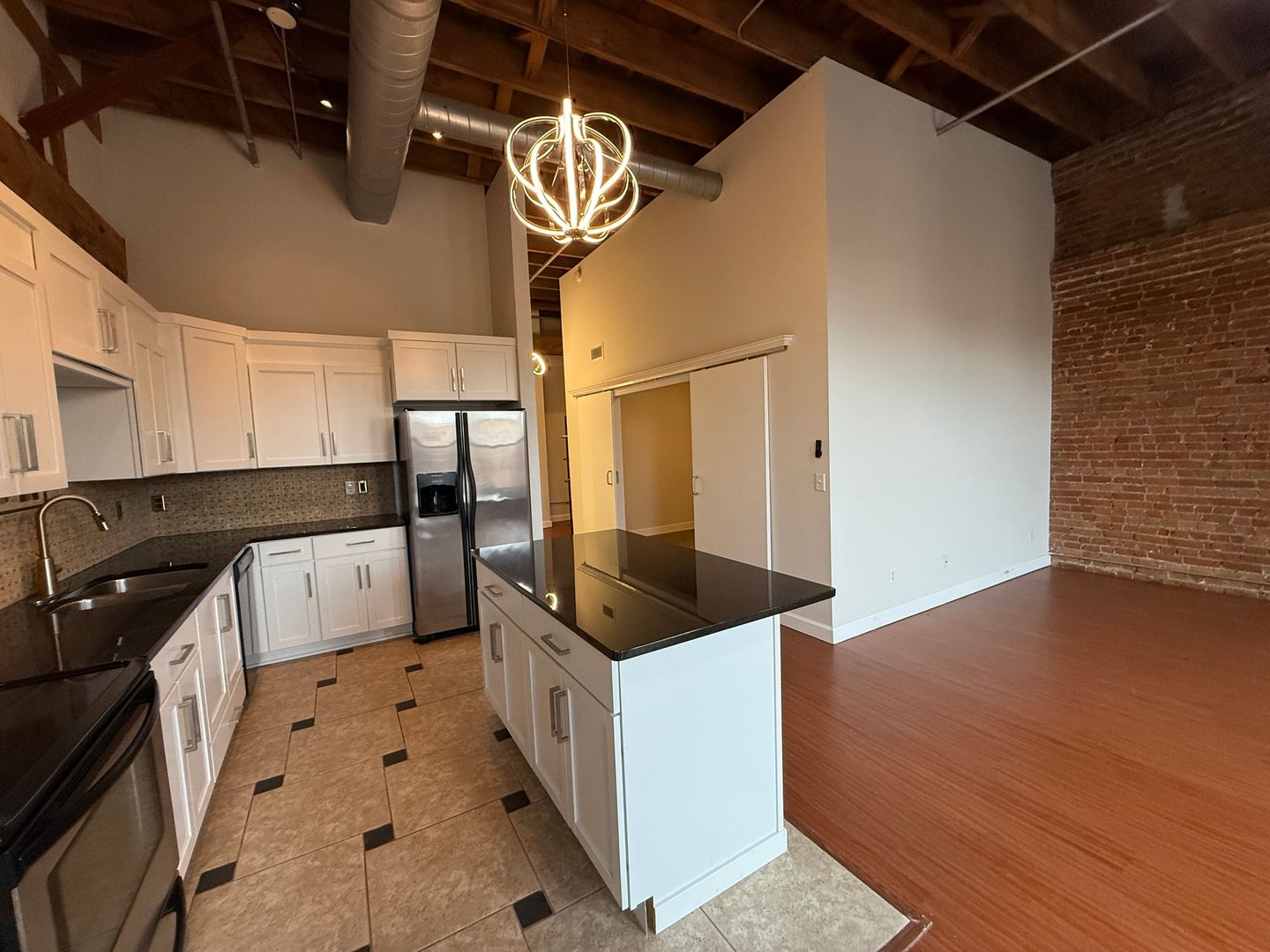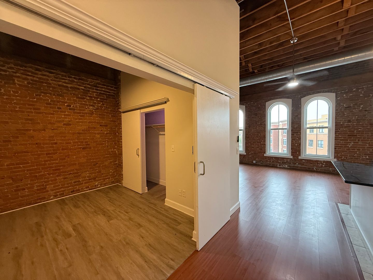 This 4th-floor apartment features an expansive open floor plan with tall ceilings, oversized windows, and beautiful exposed brick walls that bring in historic charm. The large kitchen includes granite countertops, a full tile backsplash, stainless steel appliances, a dishwasher, and a spacious center island perfect for cooking or entertaining. Tiled flooring in both the kitchen and bathroom provides a clean, modern finish, while chandeliers, barn doors, and remote-controlled ceiling fans and lighting add thoughtful style throughout. The generous living room offers plenty of space, and the versatile bonus area can be used as an office, dining room, or oversized mud room depending on your needs. With elevator access and an updated layout designed for comfort and functionality, this home delivers an exceptional downtown living experience close to restaurants, transit, and entertainment.