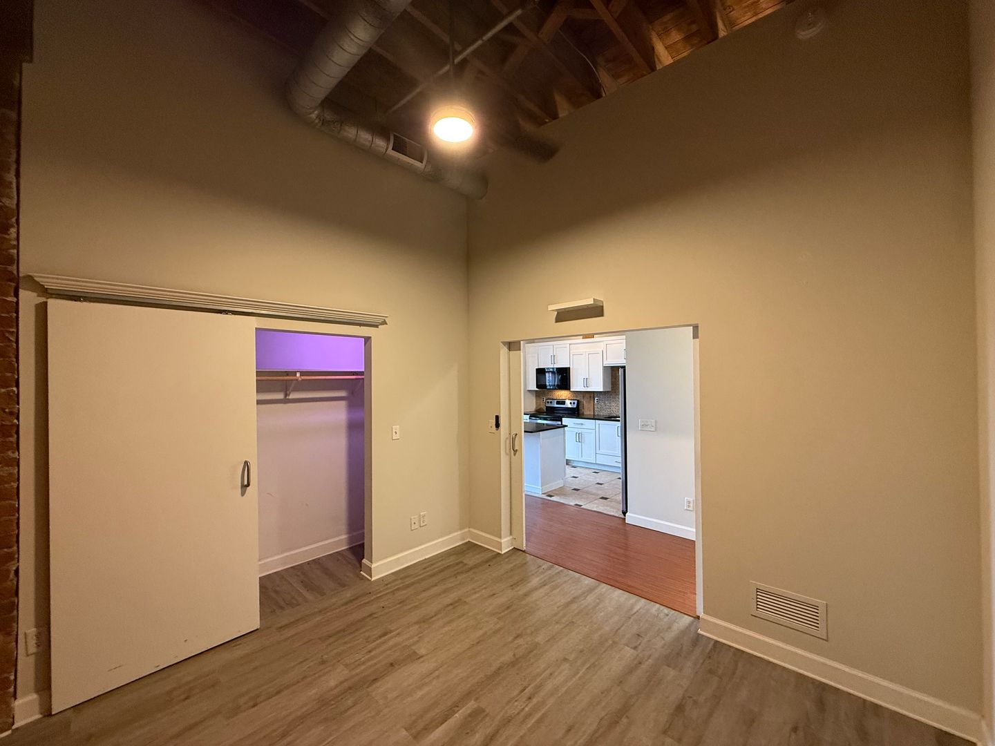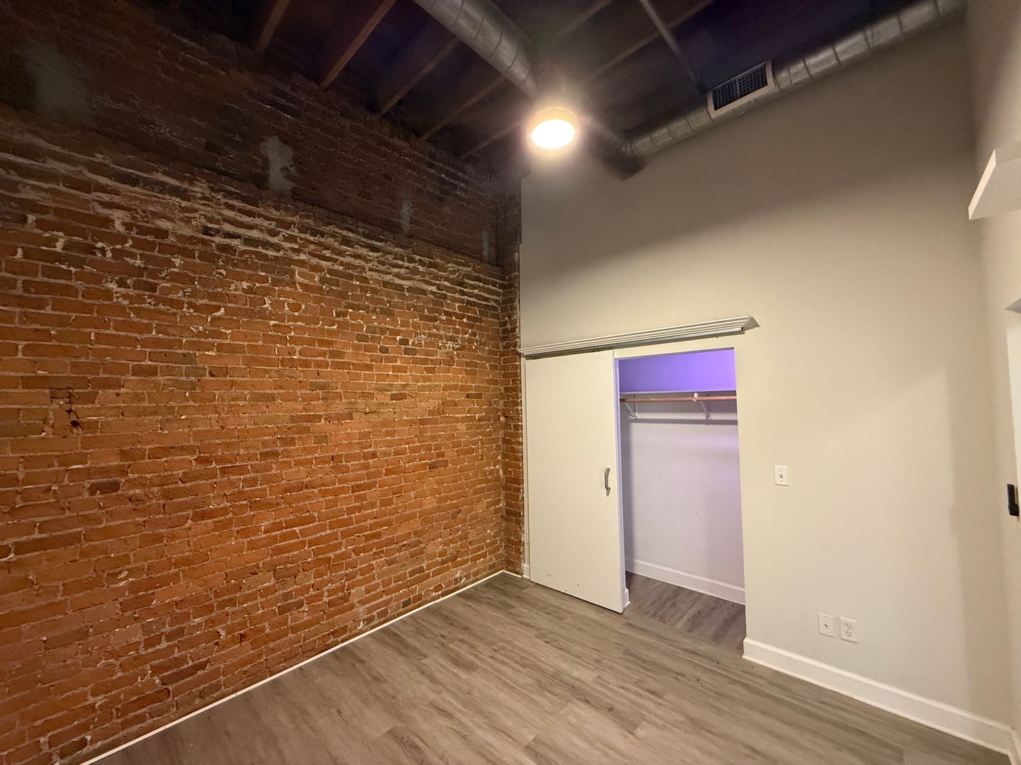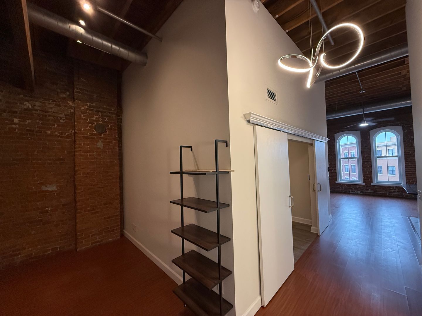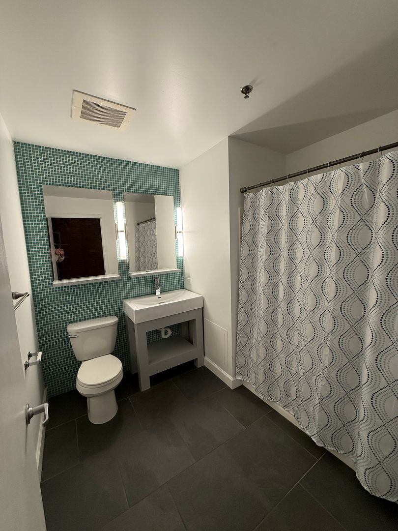 This 4th-floor apartment features an expansive open floor plan with tall ceilings, oversized windows, and beautiful exposed brick walls that bring in historic charm. The large kitchen includes granite countertops, a full tile backsplash, stainless steel appliances, a dishwasher, and a spacious center island perfect for cooking or entertaining. Tiled flooring in both the kitchen and bathroom provides a clean, modern finish, while chandeliers, barn doors, and remote-controlled ceiling fans and lighting add thoughtful style throughout. The generous living room offers plenty of space, and the versatile bonus area can be used as an office, dining room, or oversized mud room depending on your needs. With elevator access and an updated layout designed for comfort and functionality, this home delivers an exceptional downtown living experience close to restaurants, transit, and entertainment.