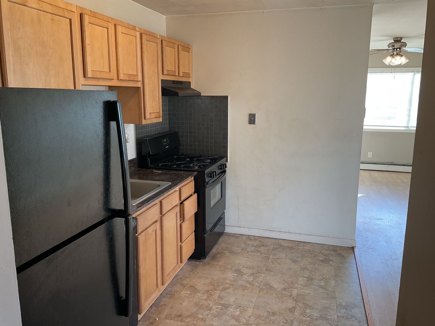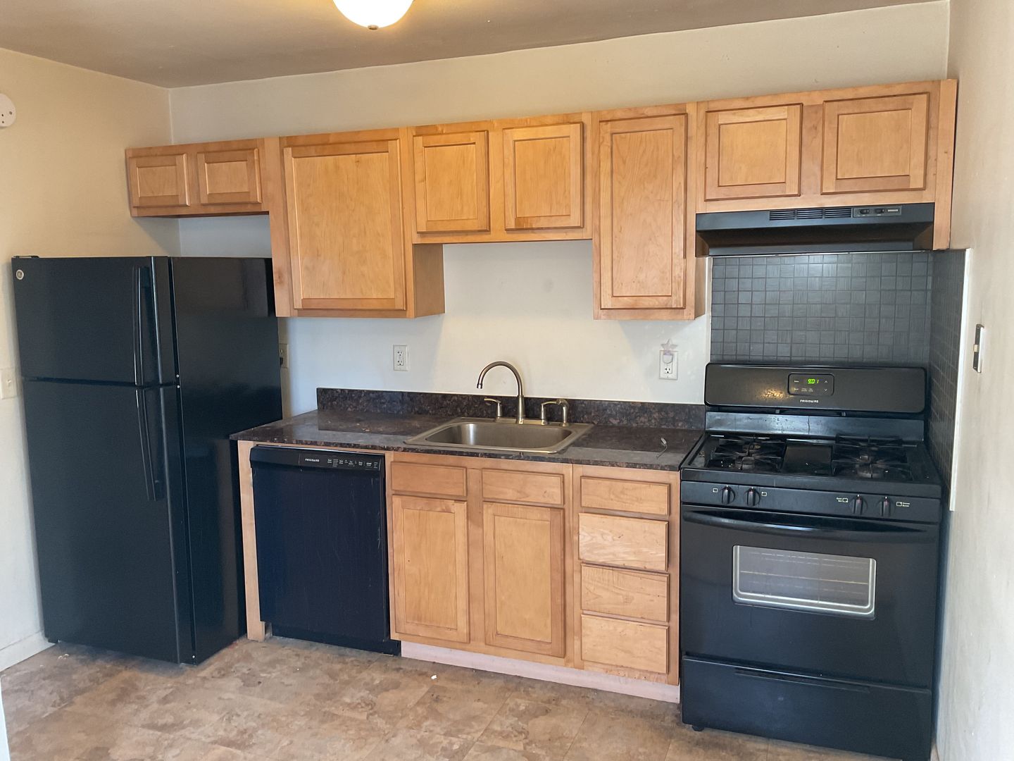 The kitchen has a full size fridge, dishwasher, a full size gas stove, and tile floor. The kitchen is open and has enough room for a dining area.