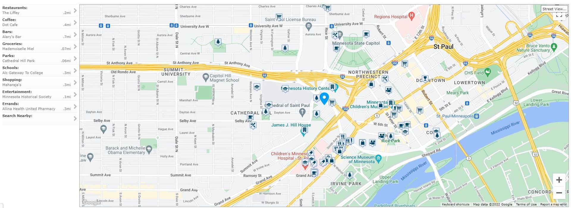 Walk or bike to local favorites like Cathedral Hill Park, the Minnesota History Center, and the Xcel Energy Center. Enjoy dining at Kincaid's, DeGidio's, or Red Rabbit, or unwind with drinks at Tom Reid's Hockey City Pub or Eagle Street Grille.