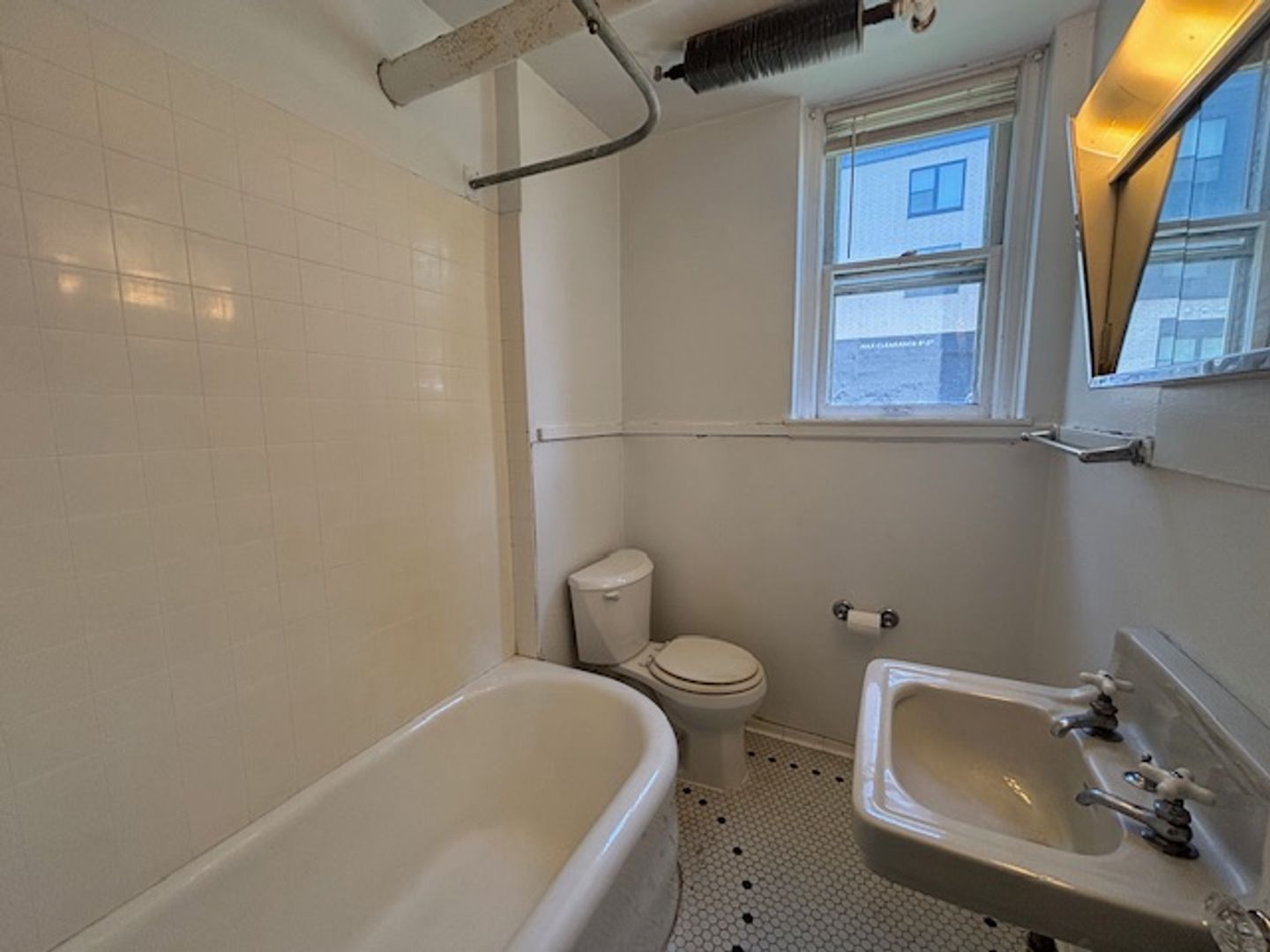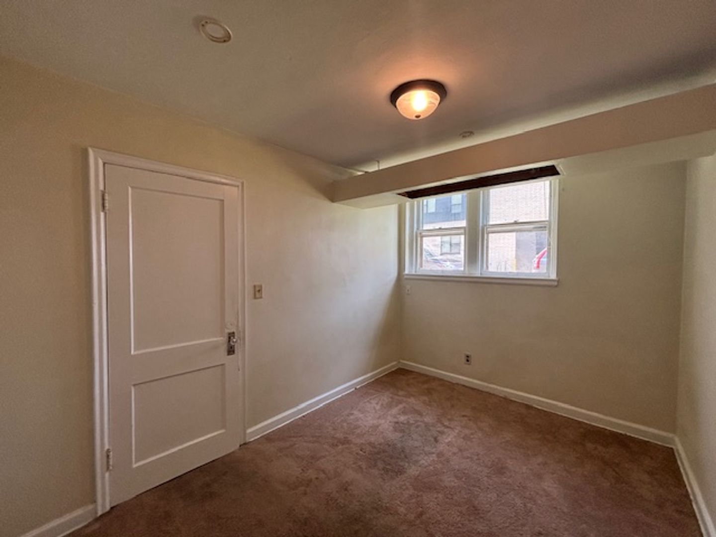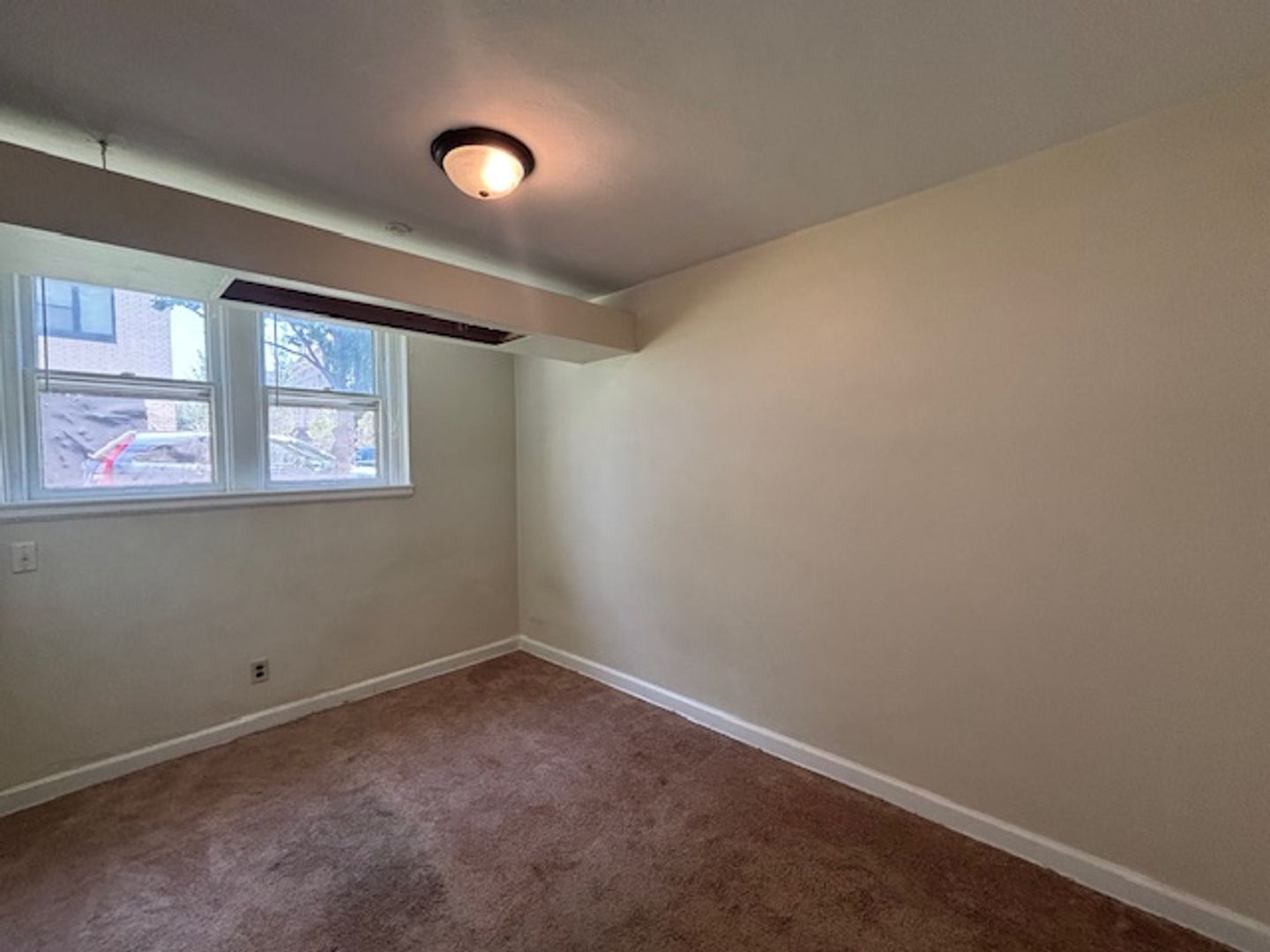 This garden level unit offers a spacious living room and bedroom, dining area, and large windows for natural lighting.