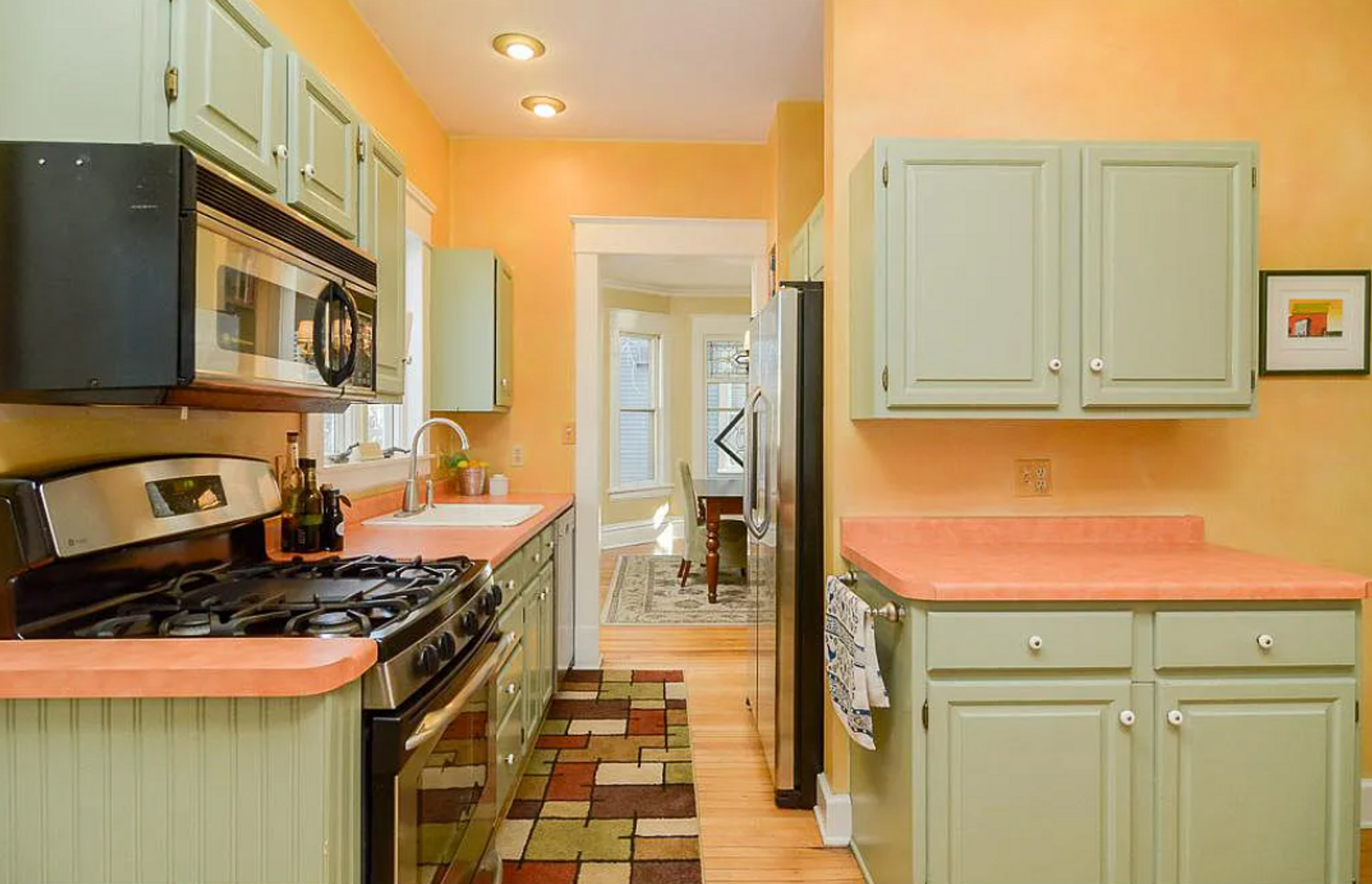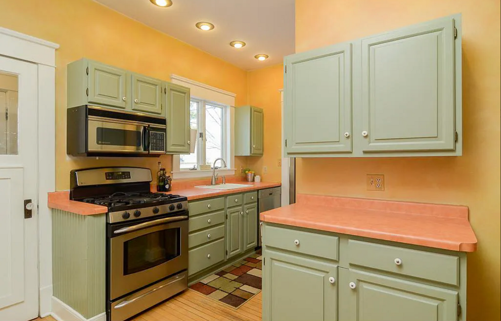 The kitchen has stainless appliances and plenty of cabinet and countertop space.
