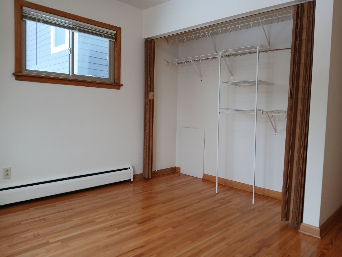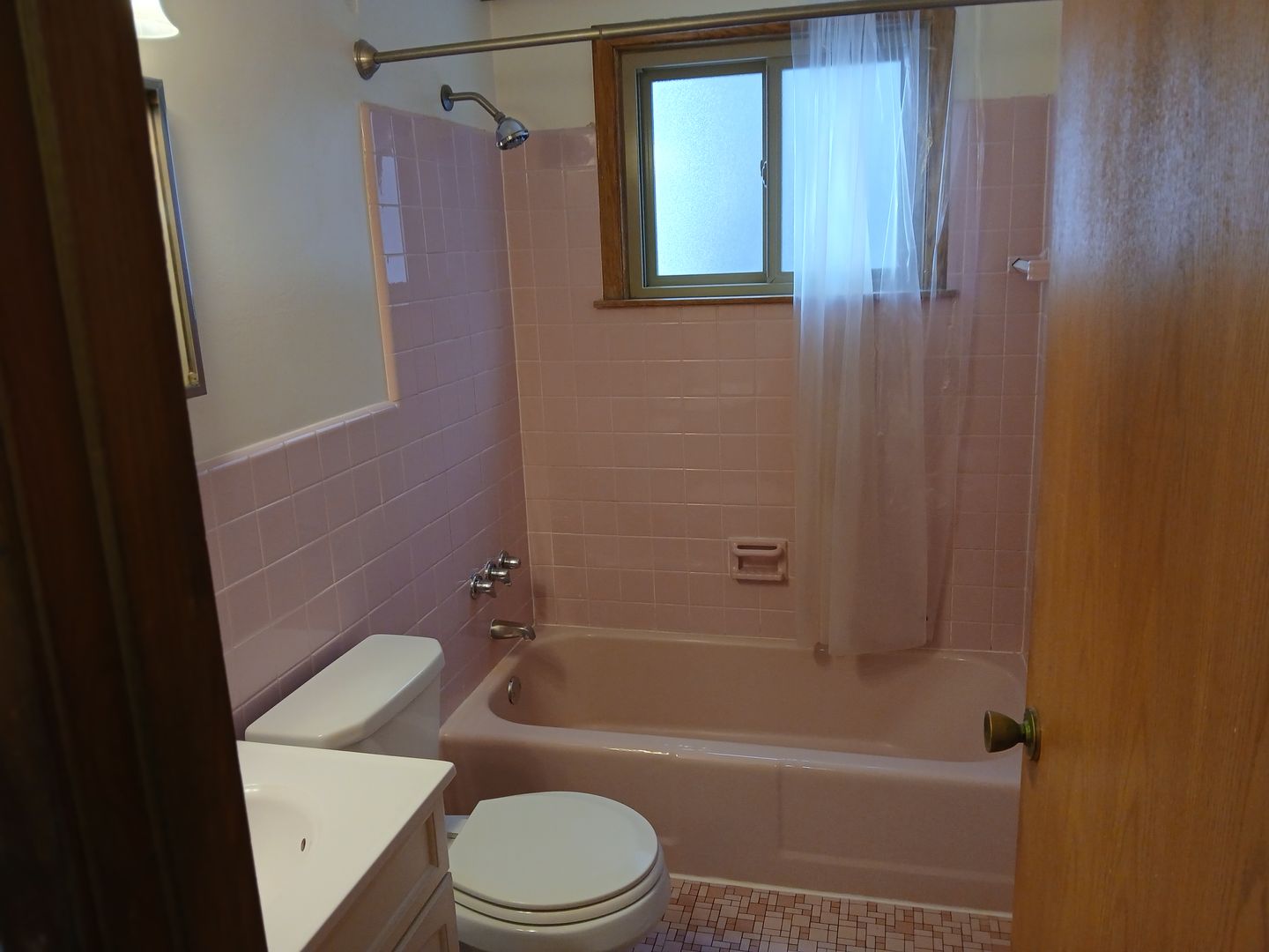 The bedroom includes hardwood floors and a generous closet. The full bath features well-maintained retro tile and vintage details.
