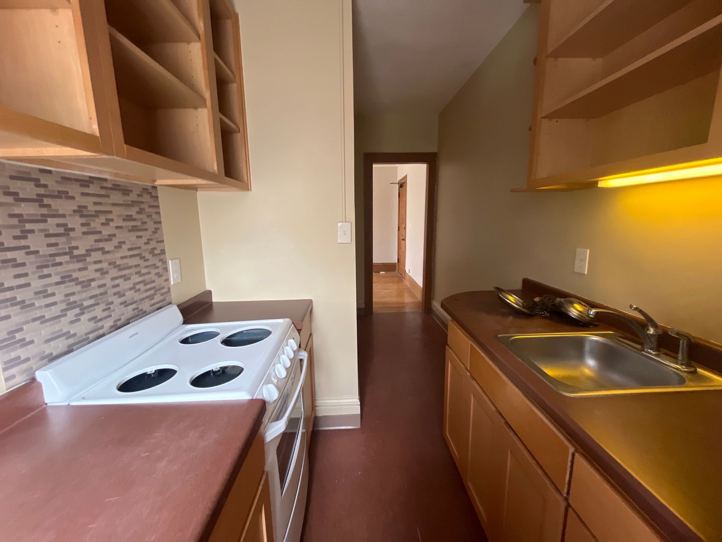 The kitchen has a practical layout with countertops and storage. The livingroom is perfect for watching televistion. The bedroom has a cozy closet with space big enough for a queen size bed. Natural light adds to the space.