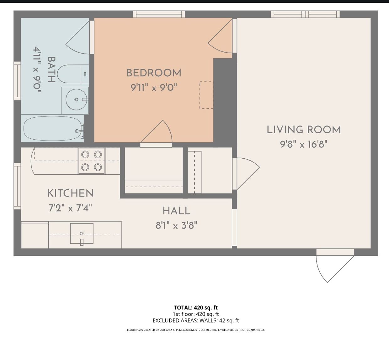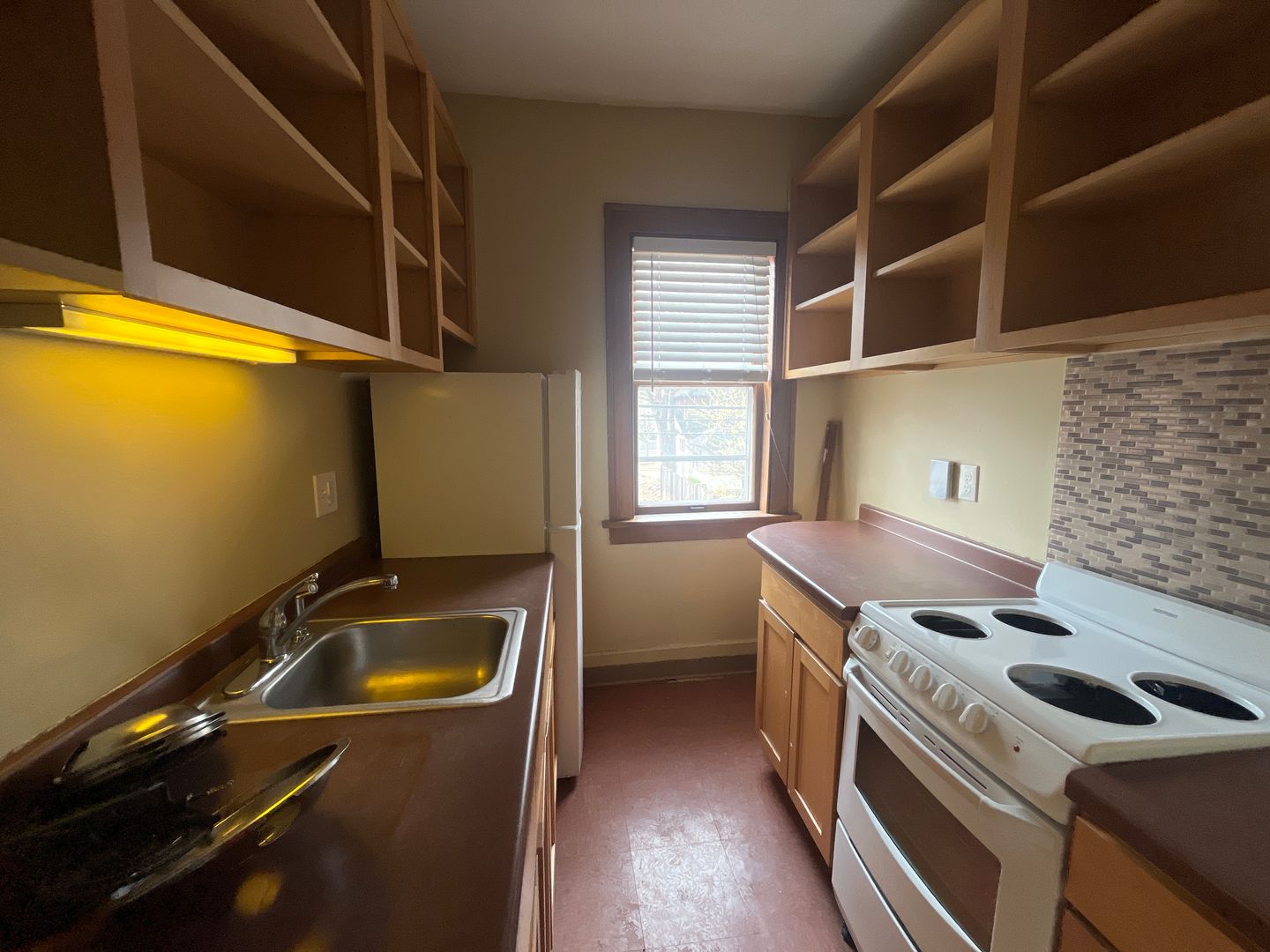 The kitchen has a practical layout with countertops and storage. The livingroom is perfect for watching televistion. The bedroom has a cozy closet with space big enough for a queen size bed. Natural light adds to the space.