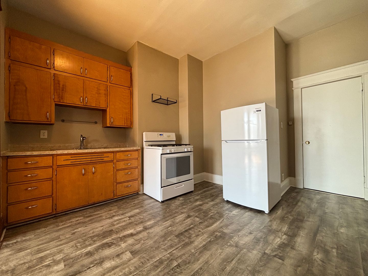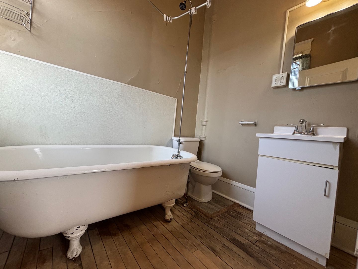 The kitchen provides generous cabinet storage, full-size appliances, and a practical layout for everyday living. The bathroom includes a vintage clawfoot tub, adding to the home’s timeless character.