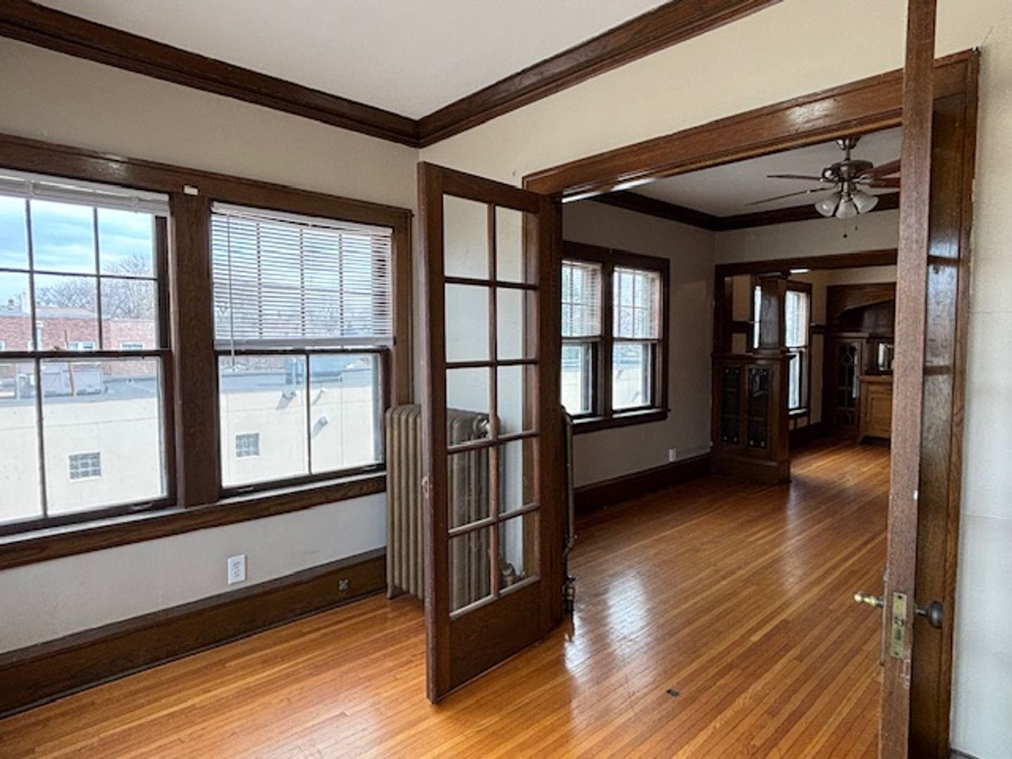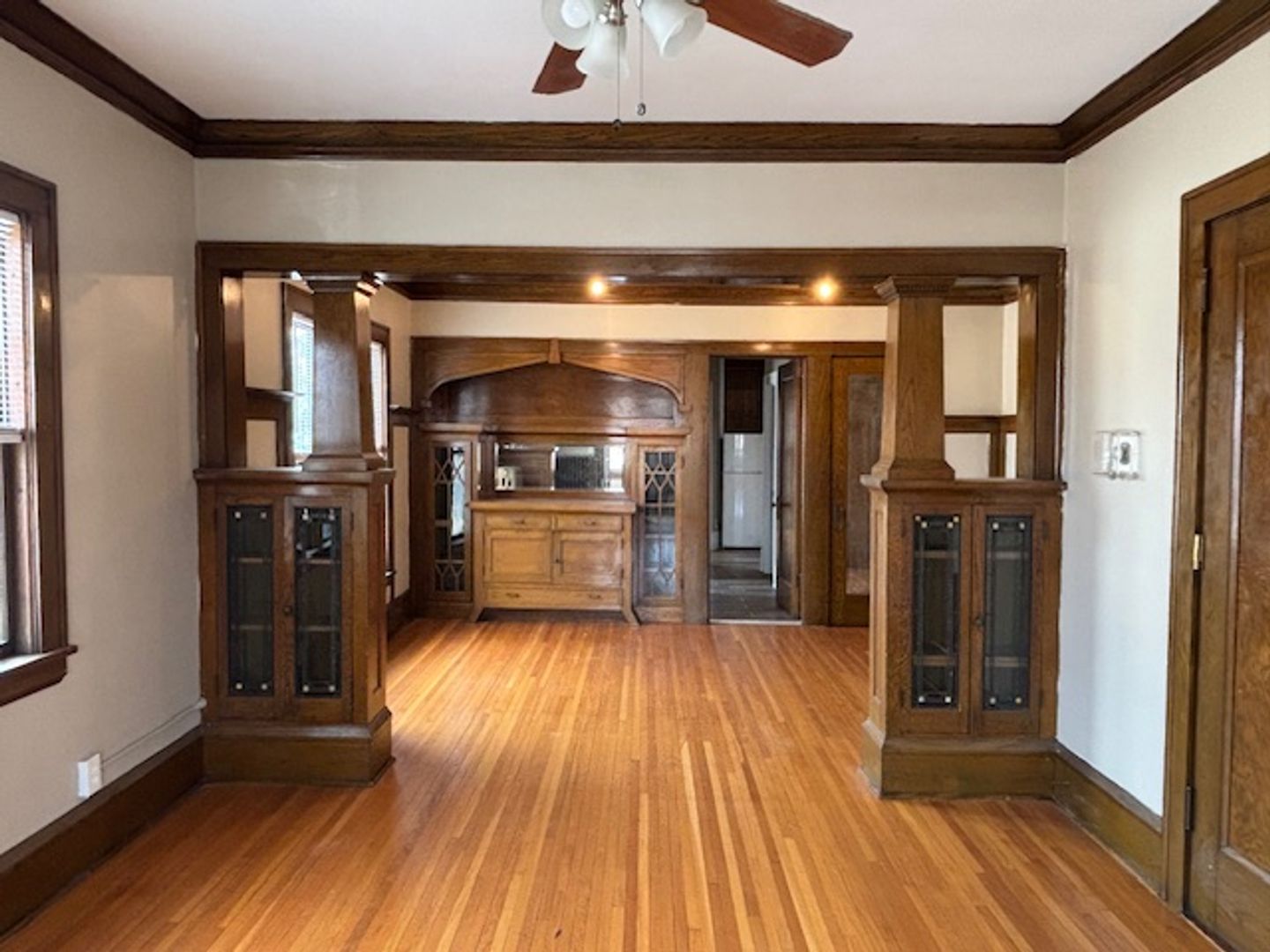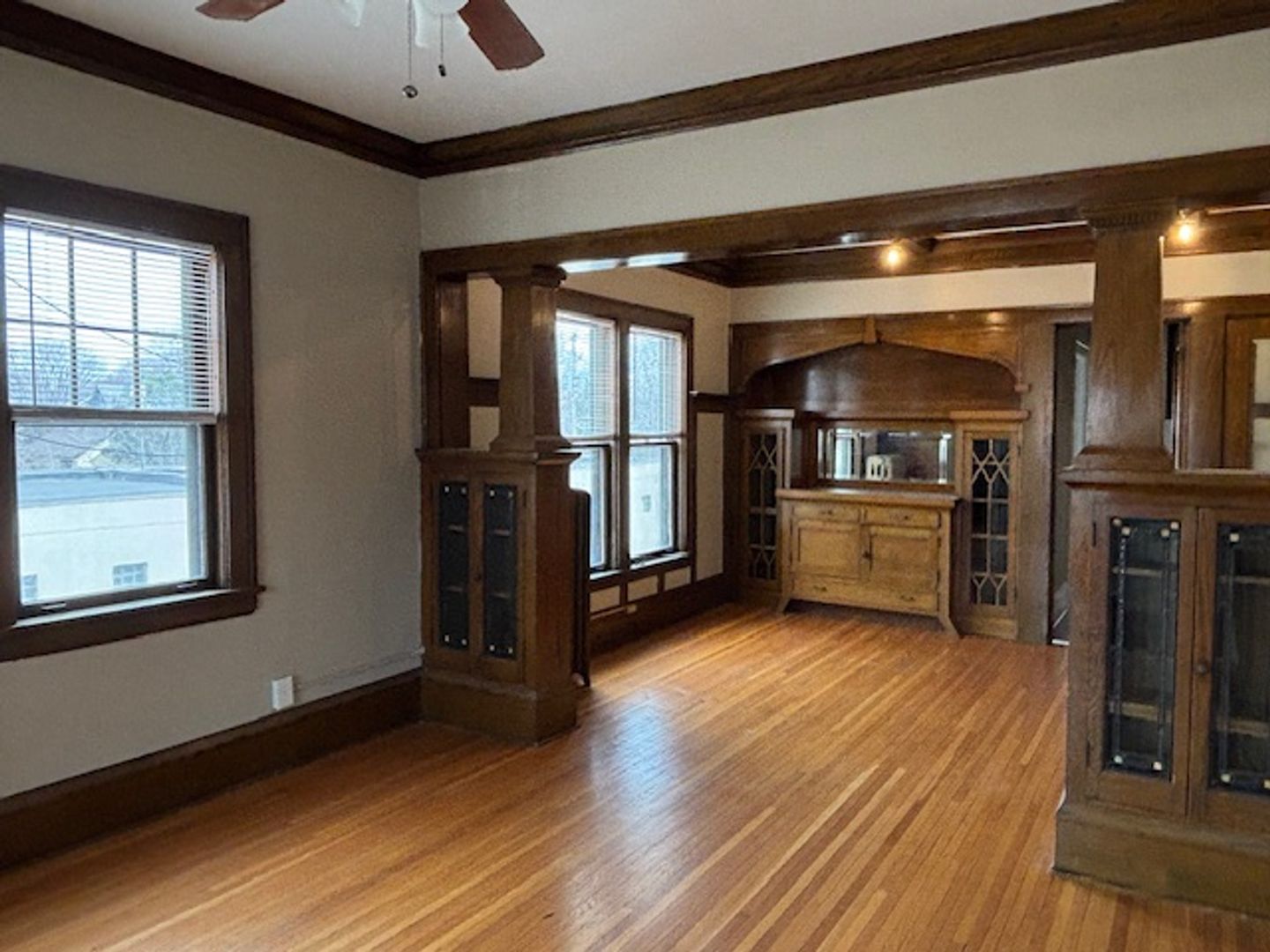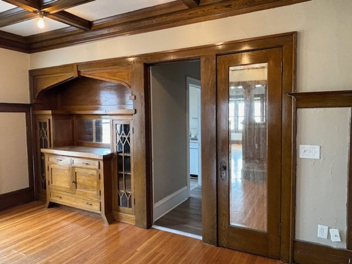 This home features gorgeous natural woodwork, a built-in buffet, hardwood floors, and is located on the upper level of this historic building.