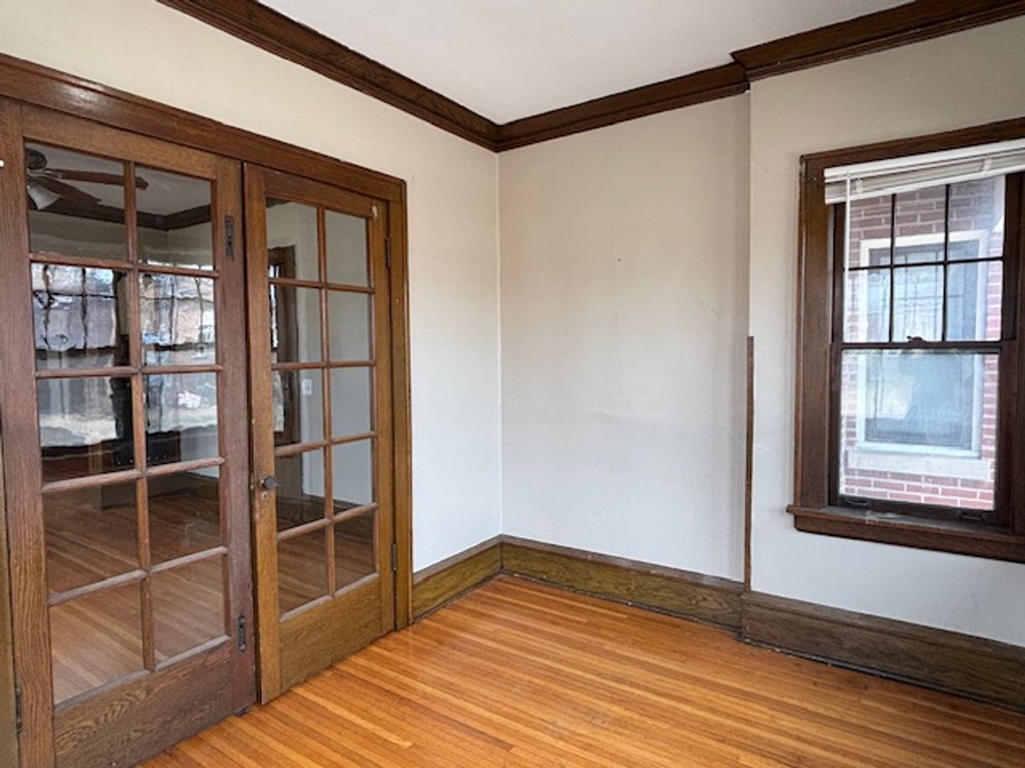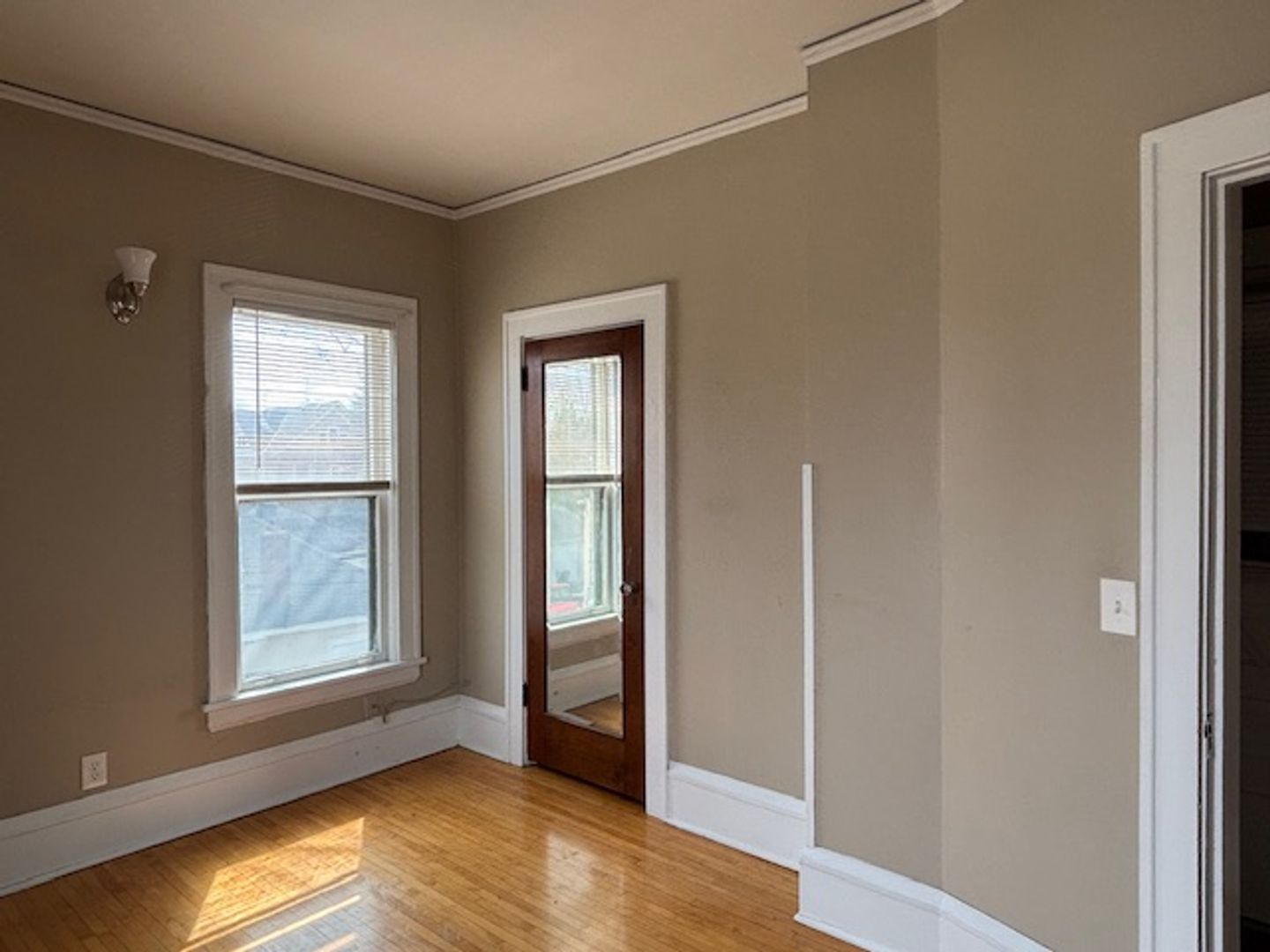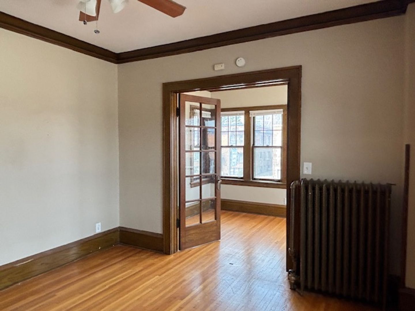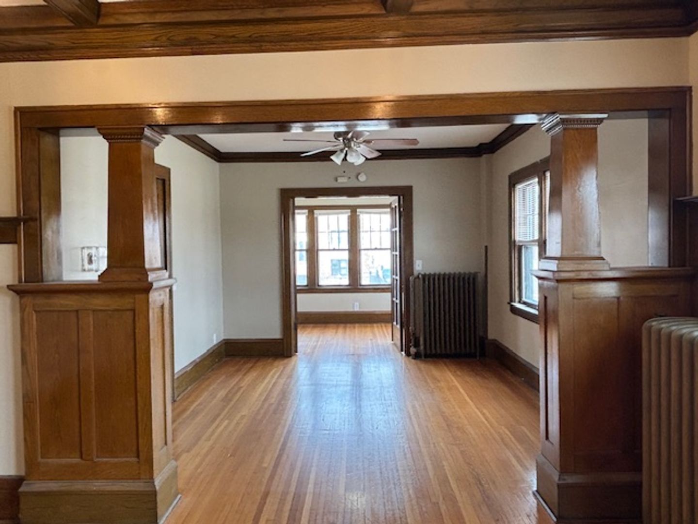 This home features gorgeous natural woodwork, a built-in buffet, hardwood floors, and is located on the upper level of this historic building.