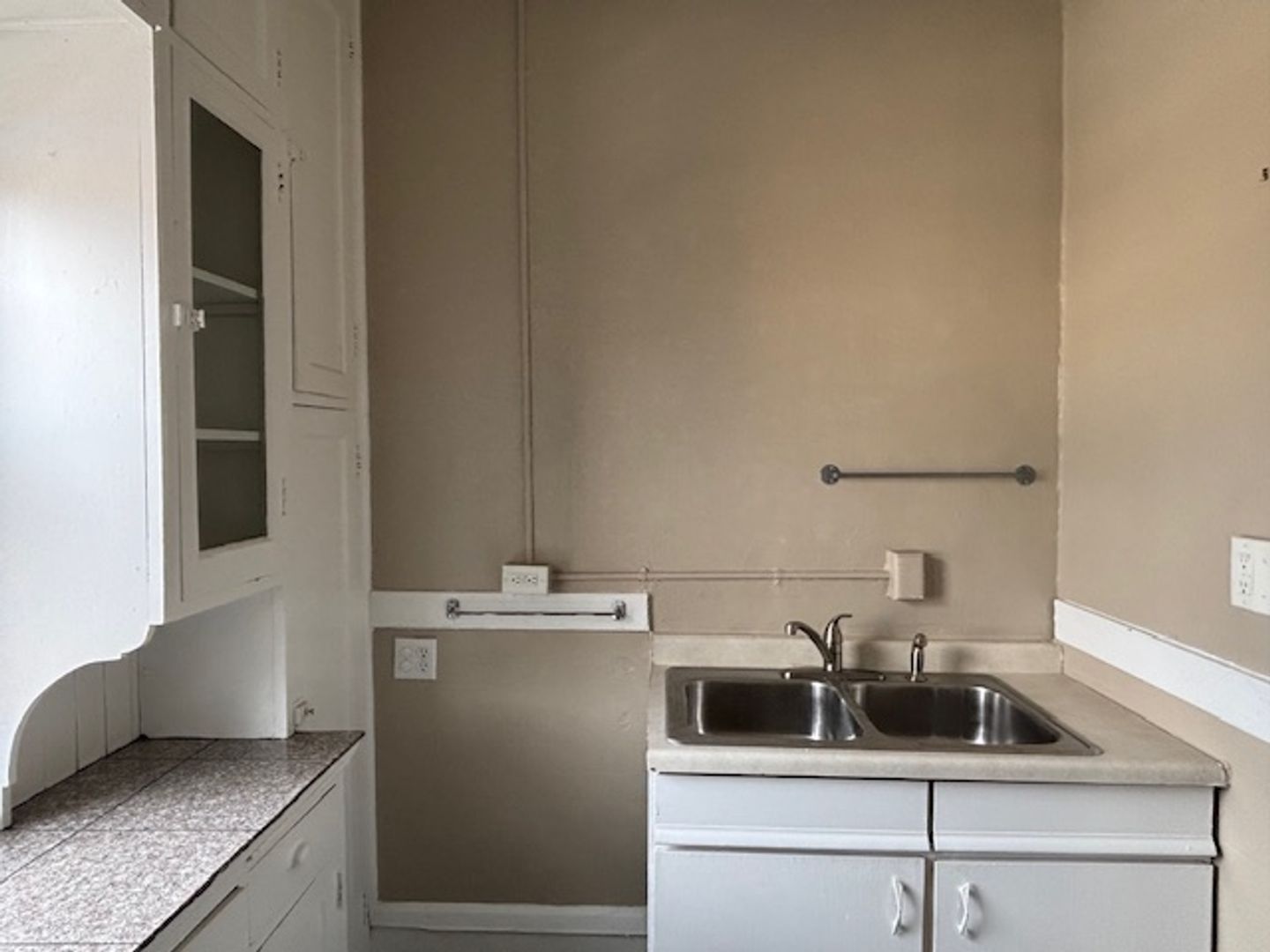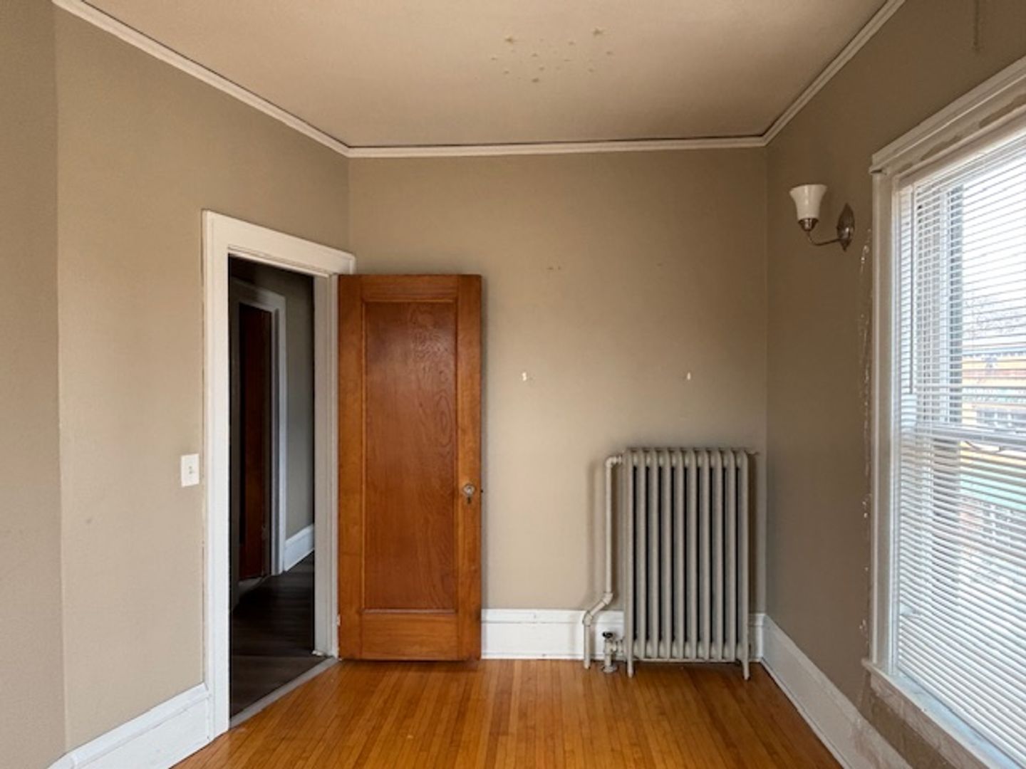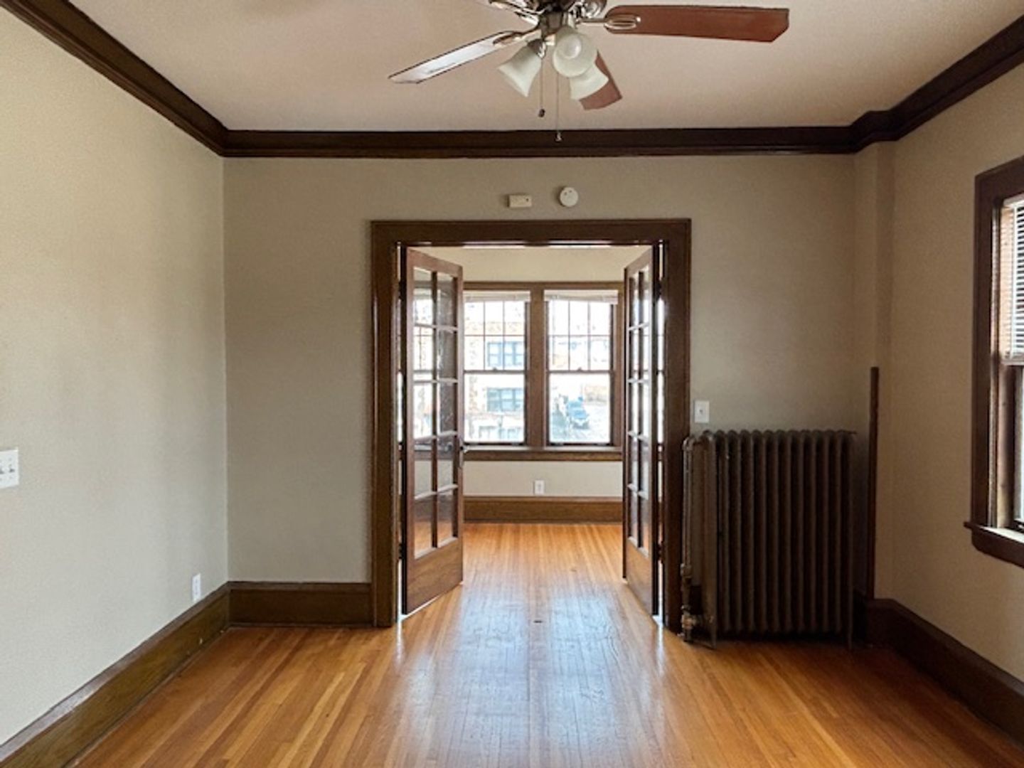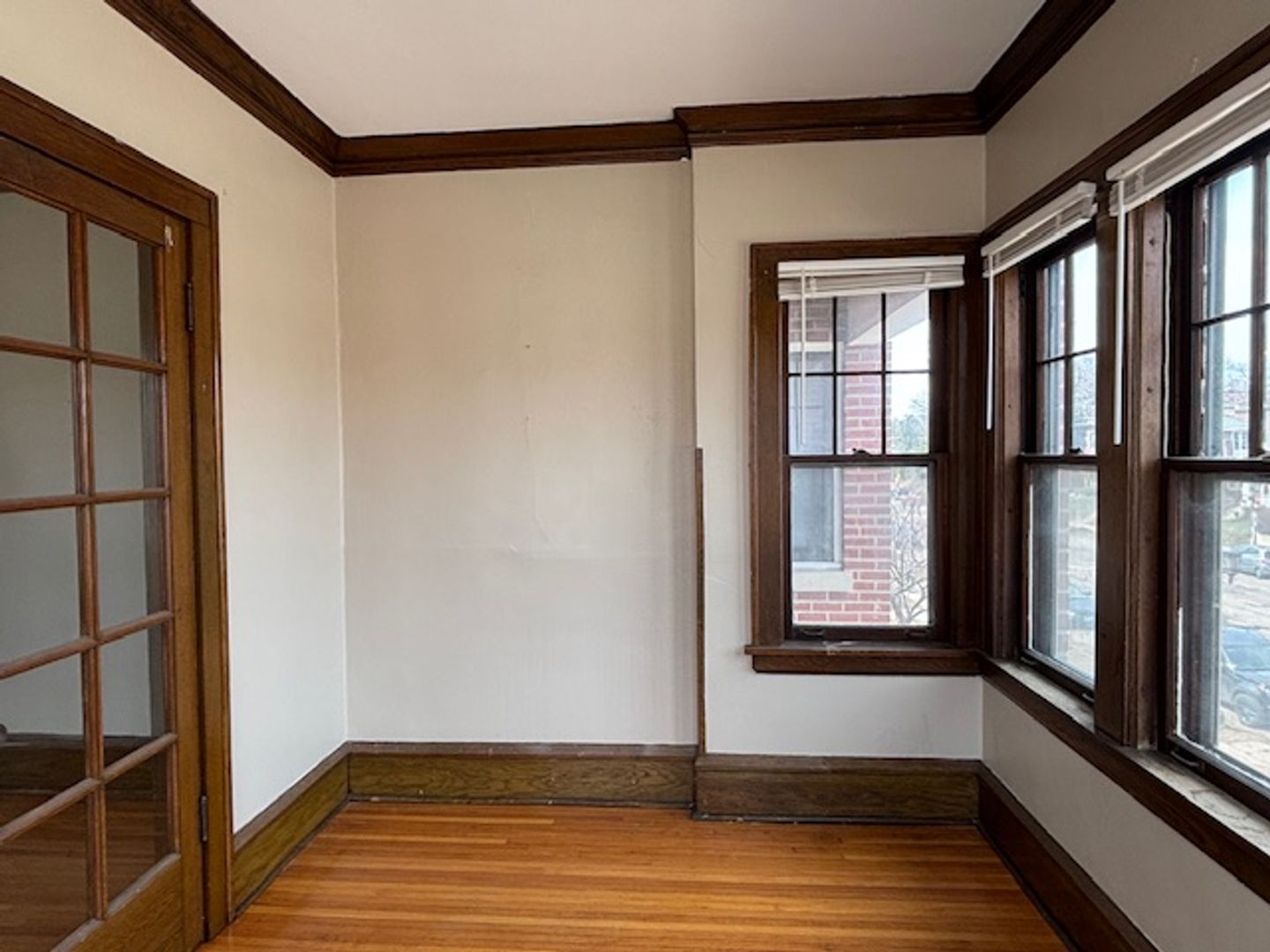 This home features gorgeous natural woodwork, a built-in buffet, hardwood floors, and is located on the upper level of this historic building.
