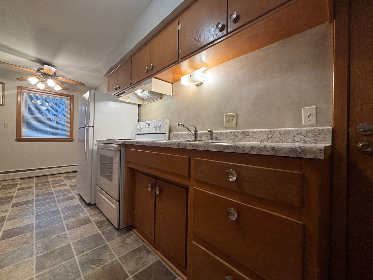 These large 1 bedrooms have a galley style kitchen with tons of cabinet and and countertop space. There is a dining room area off kitchen fit for a small table, a large living room, wall A/C and a bedroom and bathroom to complete unit. Free off street parking.