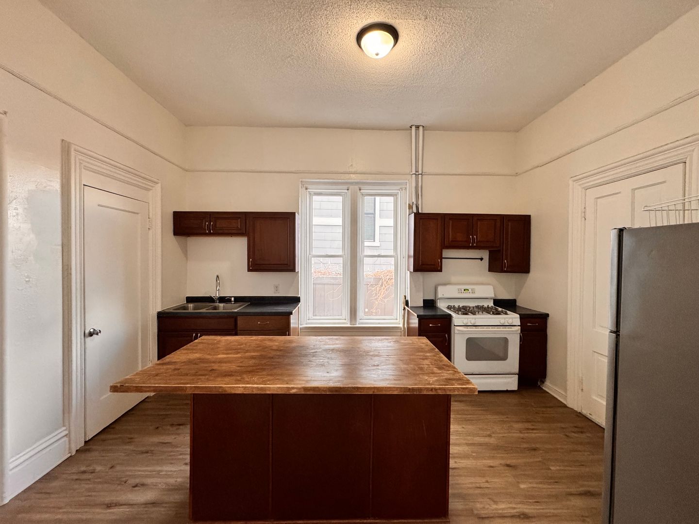 **Updated and Open Kitchen: featuring gas range/stove, refrigerator, ample cabinetry, and a nice center island