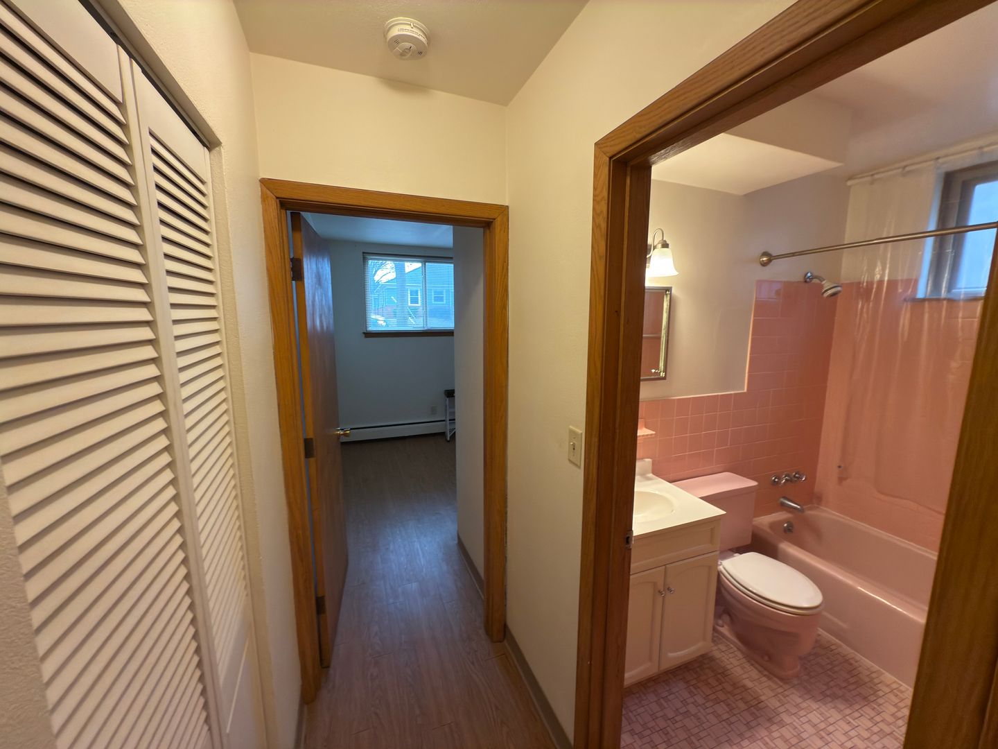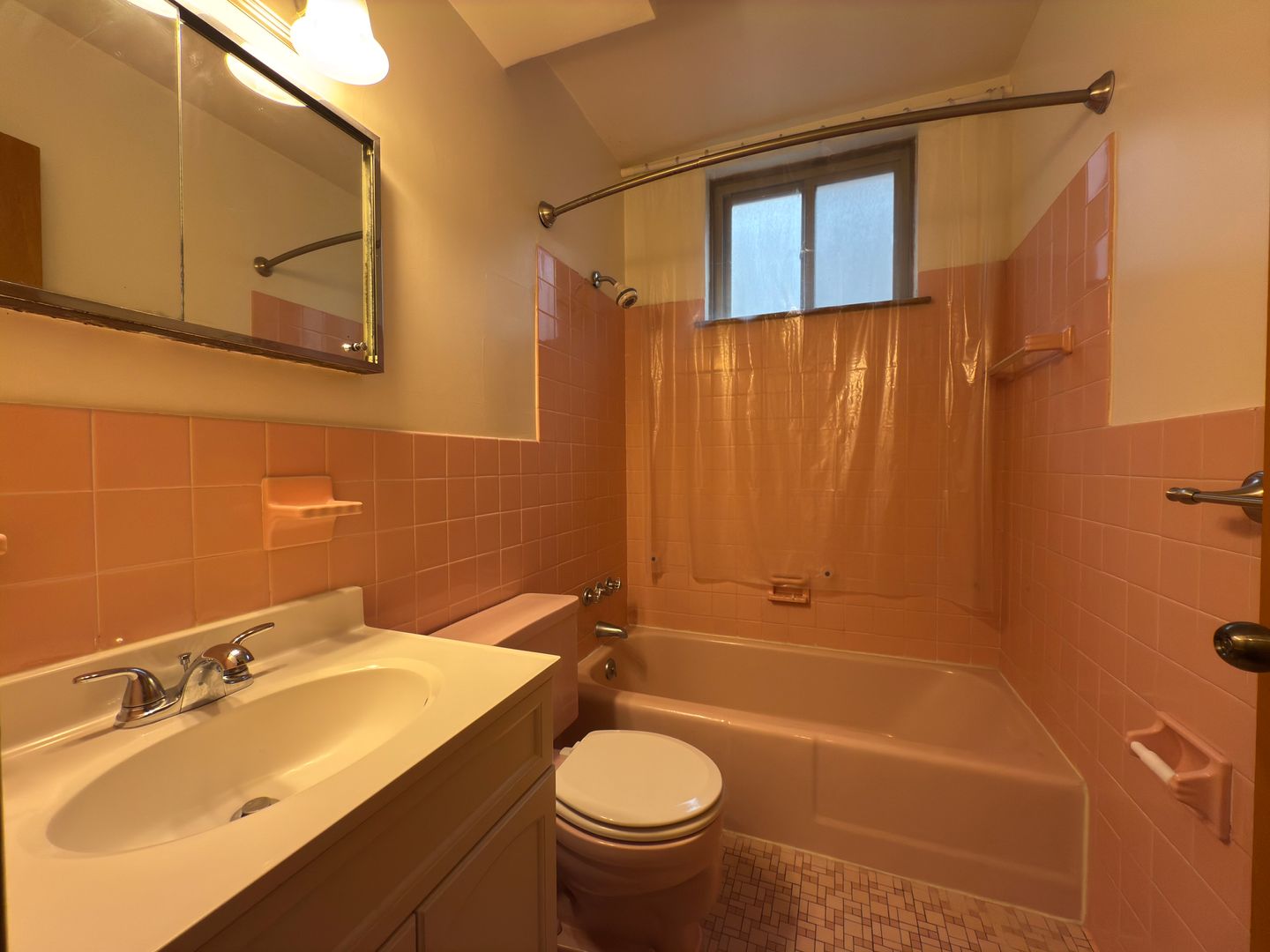 The bathroom keeps its classic pink tile character while offering a clean and well-maintained space. Residents also enjoy access to on-site laundry, a free storage locker, and optional off-street parking available for $60/month.