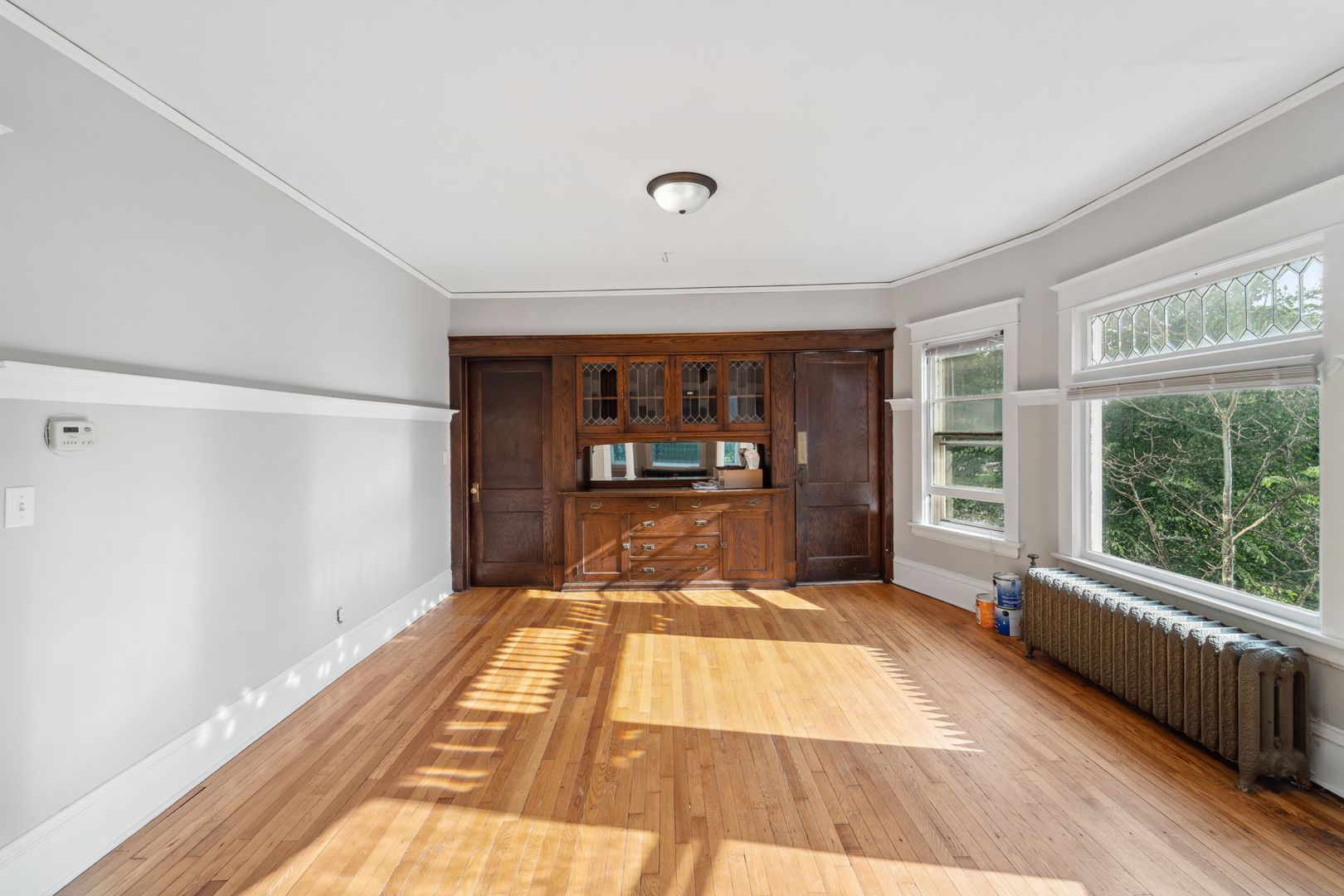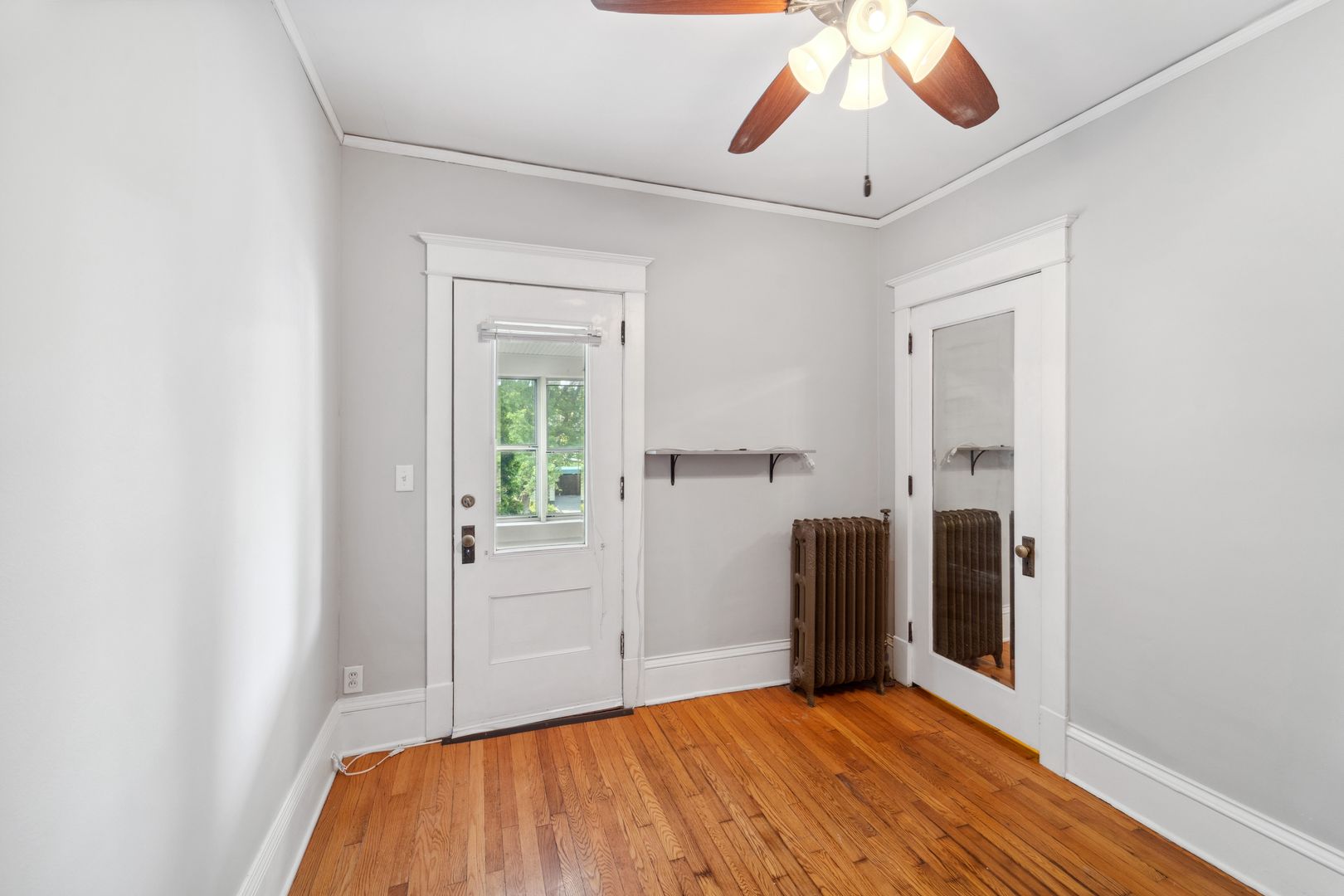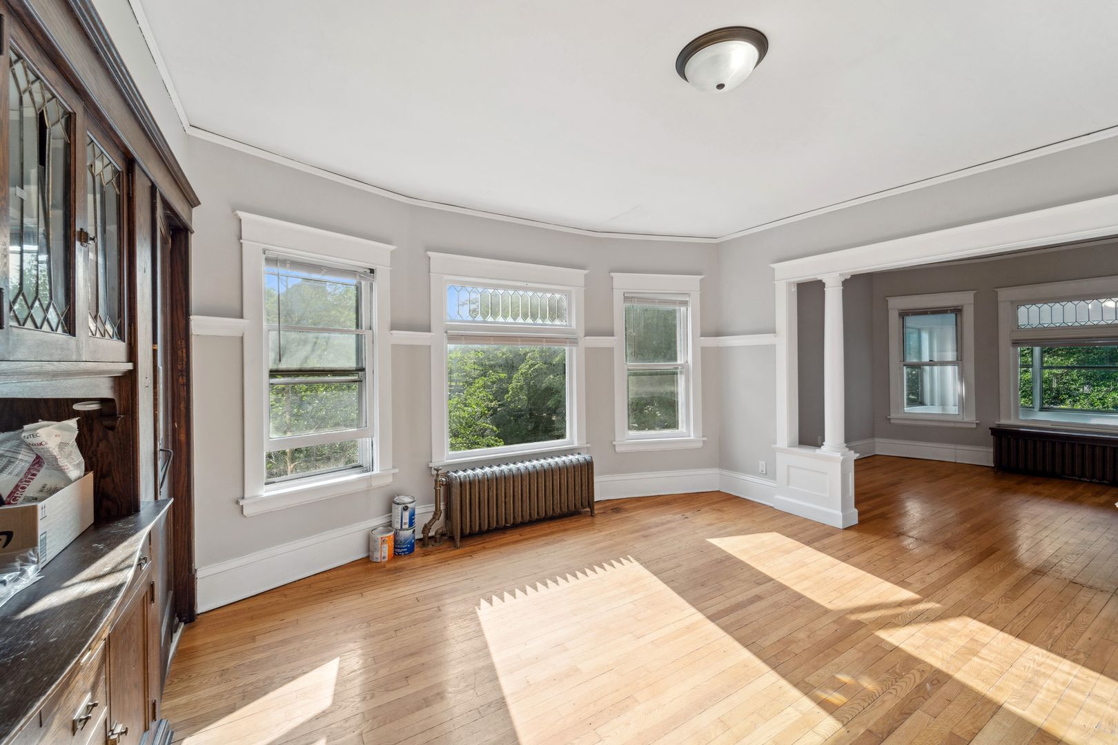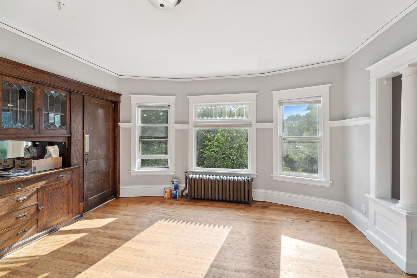 This upper-level duplex is located on a quiet corner lot in a nice Saint Paul neighborhood. It has a front porch that’s great for relaxing and a back deck and patio where you can spend time outside or have a barbecue. The home has a lot of natural light, with bright hardwood floors, and original built-in cabinets that give it some classic charm. Crown molding adds a nice touch to the space, and ceiling fans help keep things comfortable.