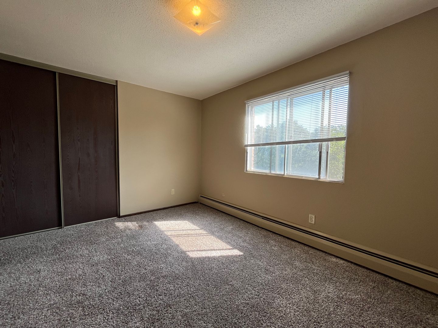 Large 2 bedroom corner unit with carpet in the living room and bedrooms. Galley kitchen with dining area. Secure building with laundry on site and off street parking included.