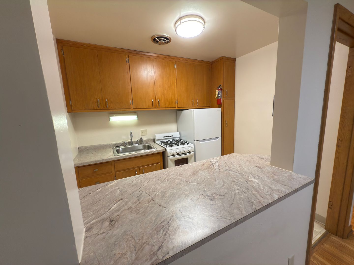The cozy kitchen offers ample cabinet space, vintage appeal, and natural light, making it an inviting space for your daily cooking needs.