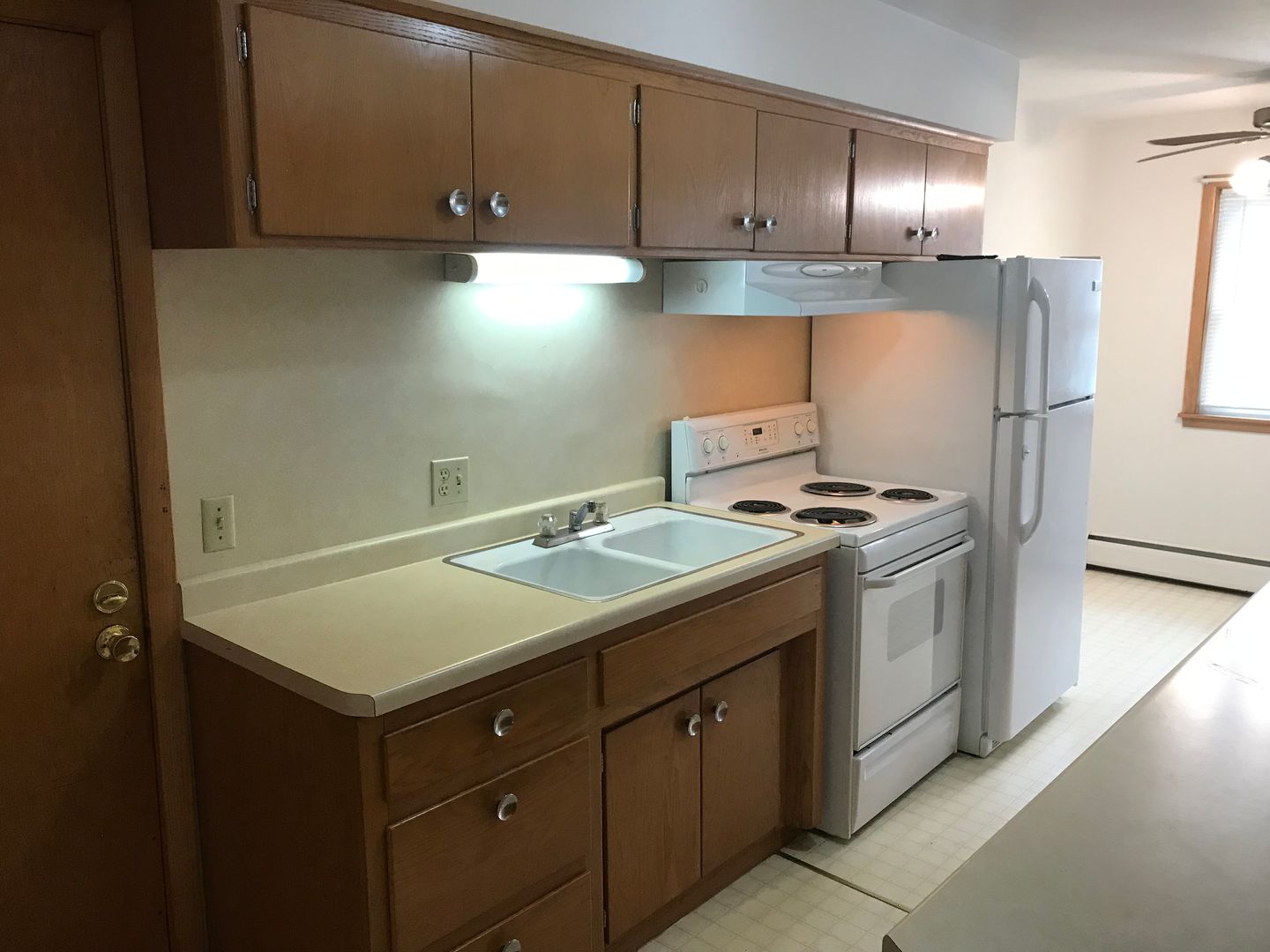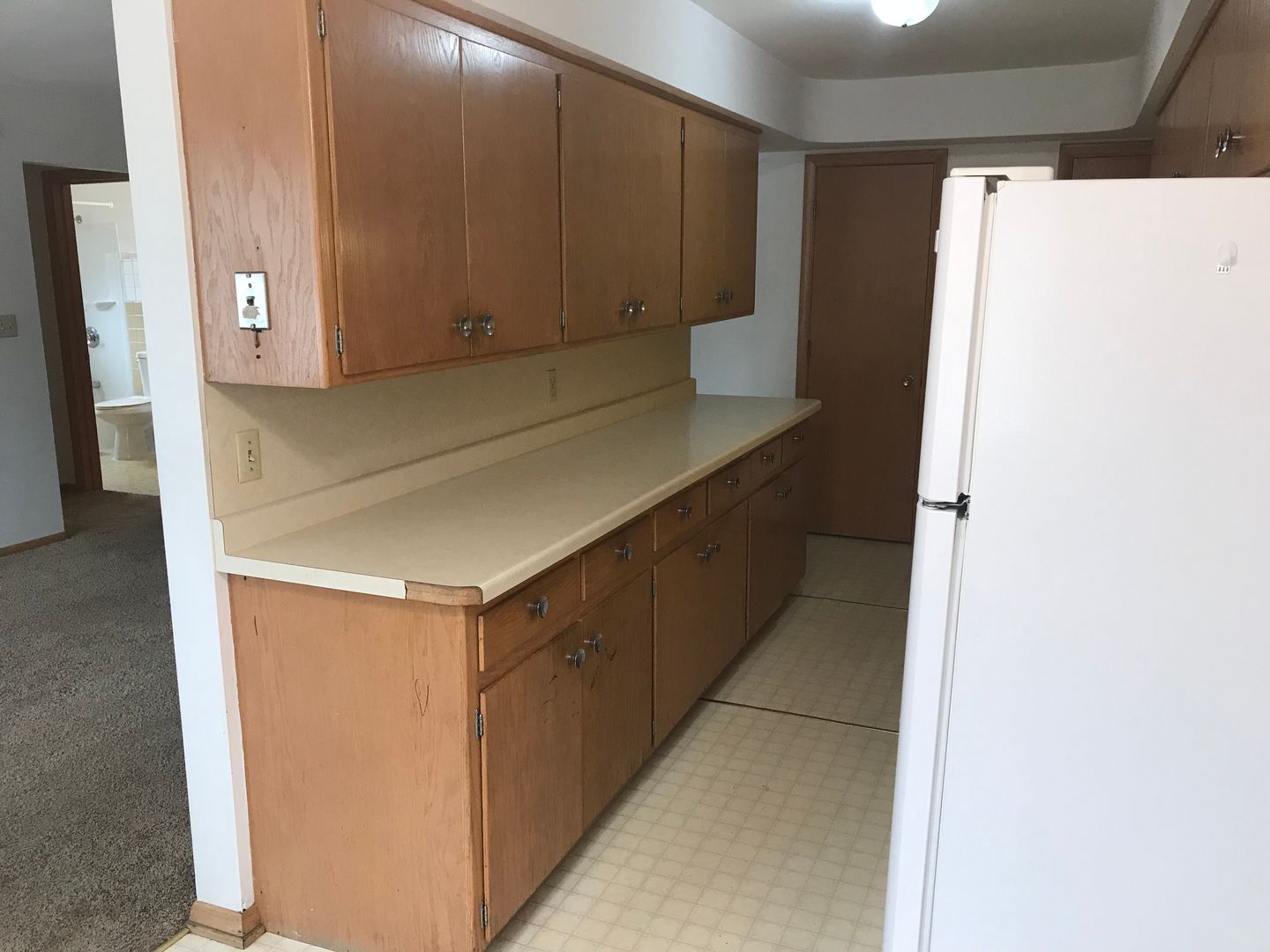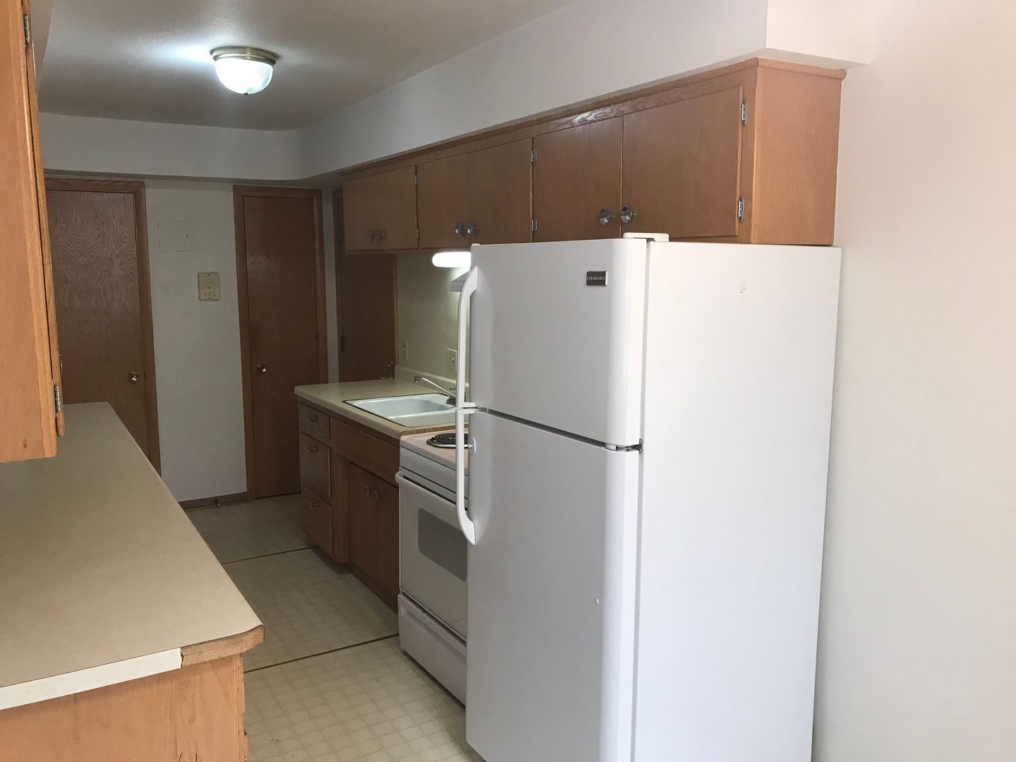 Large 1 bedrooms have a galley style kitchen with tons of cabinet and and countertop space.