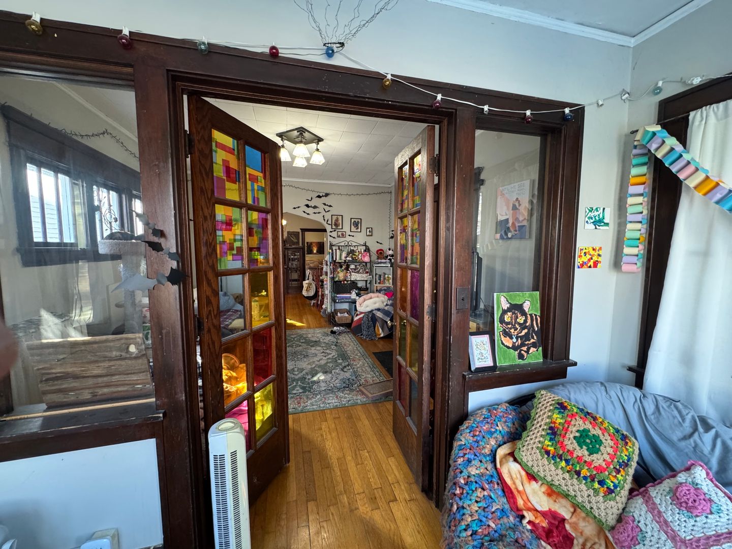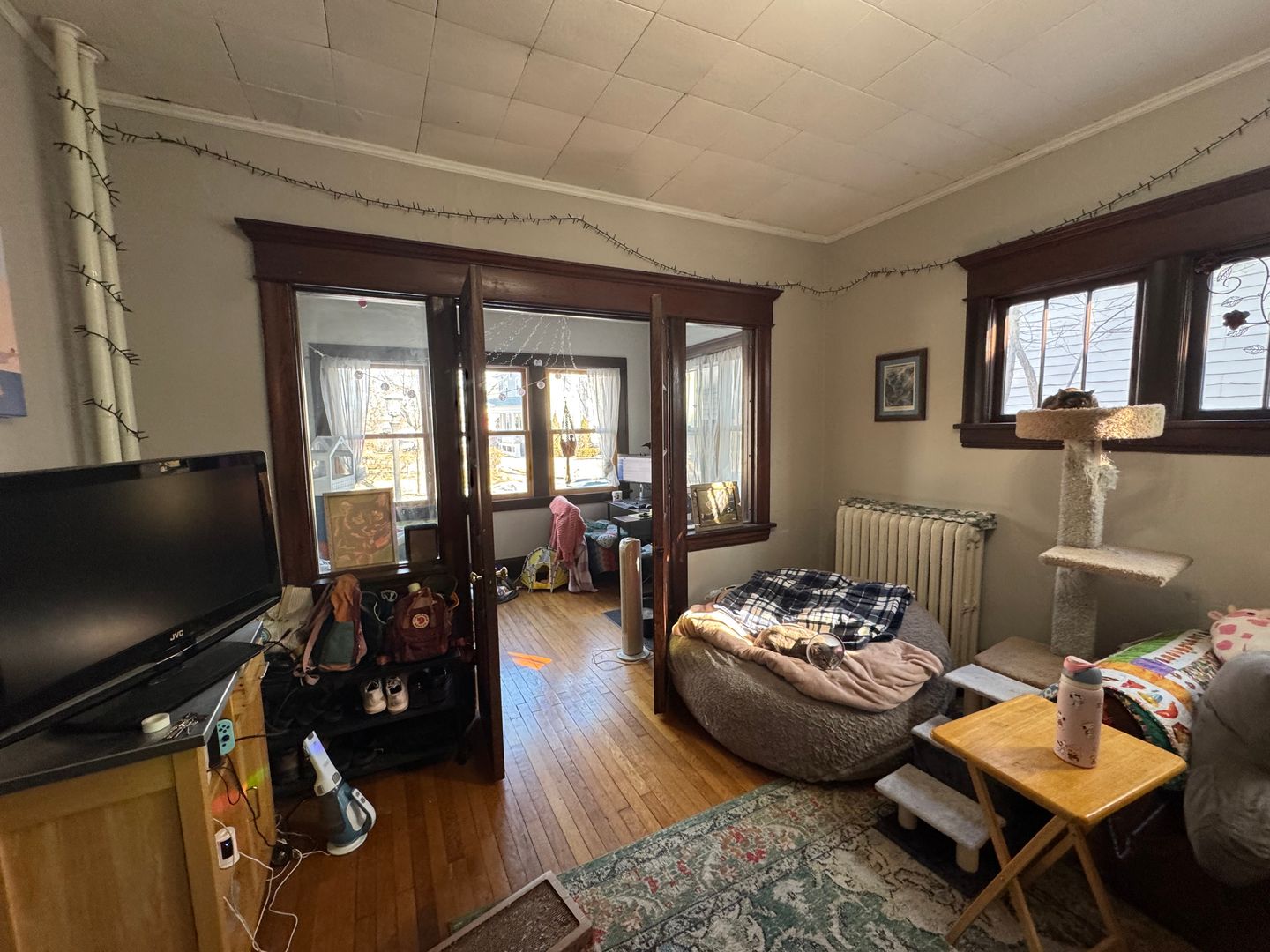 This one-bedroom one-bath apartment has amazing character—that arched opening, wood trim, and built-in cabinet are beautiful. It feels cozy and vintage. The space has a lot of natural light and beautiful French doors to separate the living room from the bedroom. There is a garage to rent for $50.00