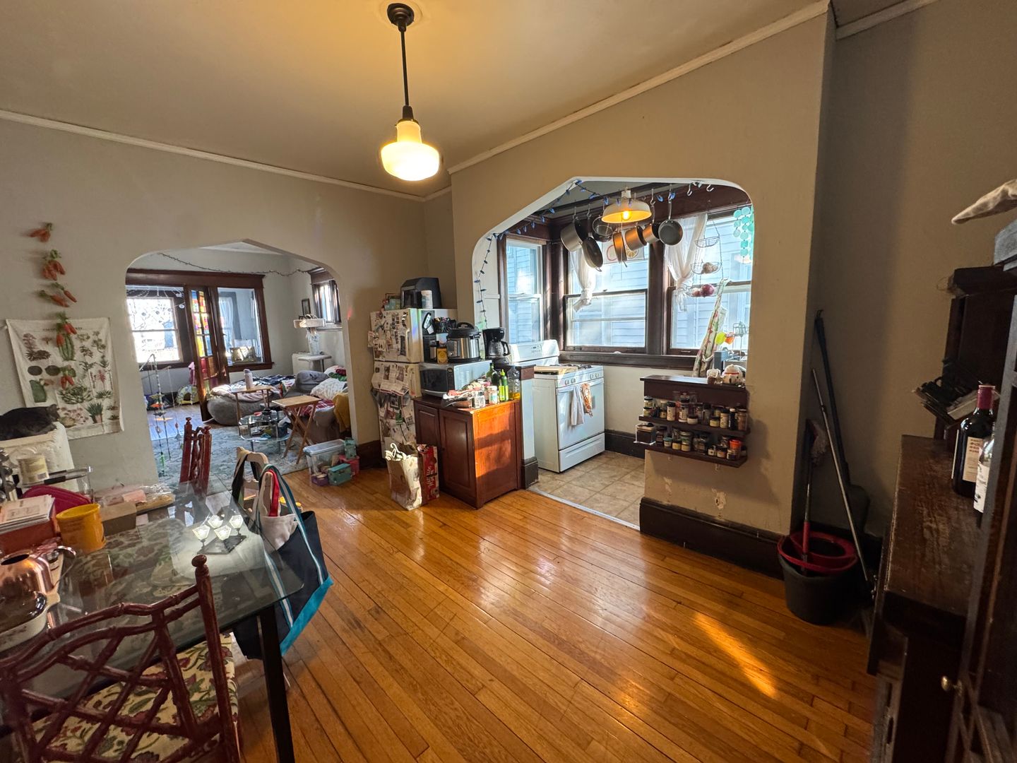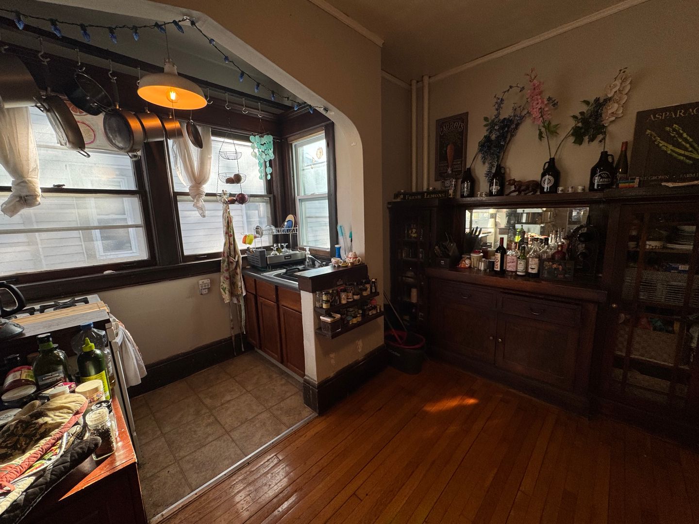 1 BR and bath has amazing character—that arched opening, wood trim, and built-in cabinet are beautiful.