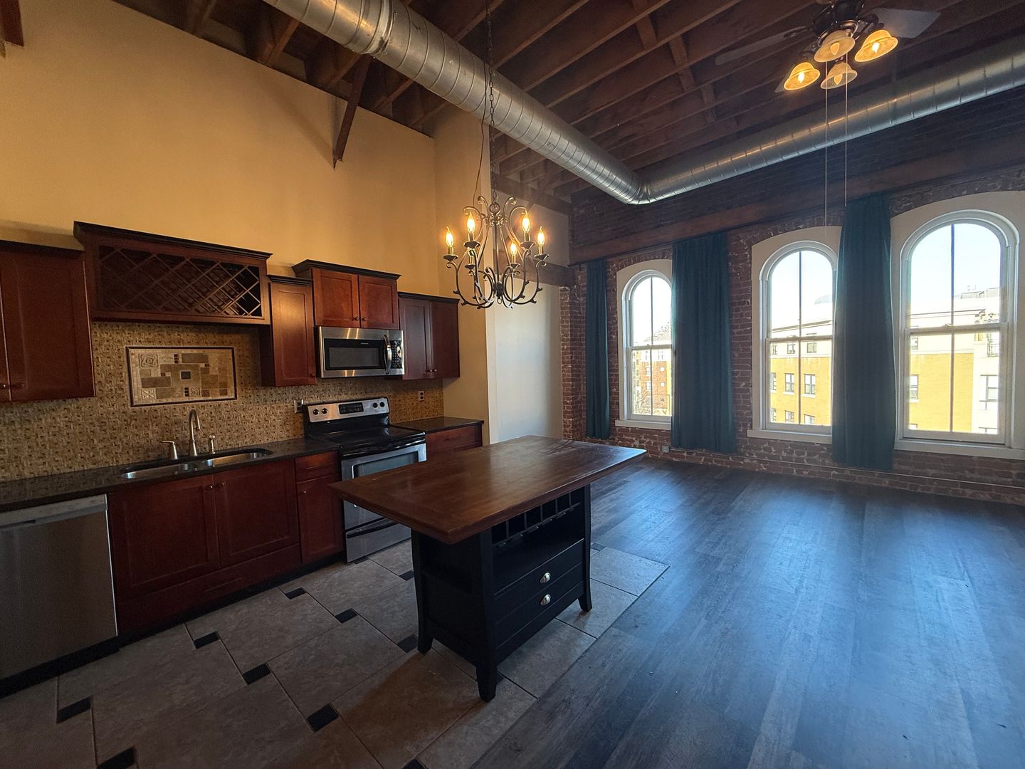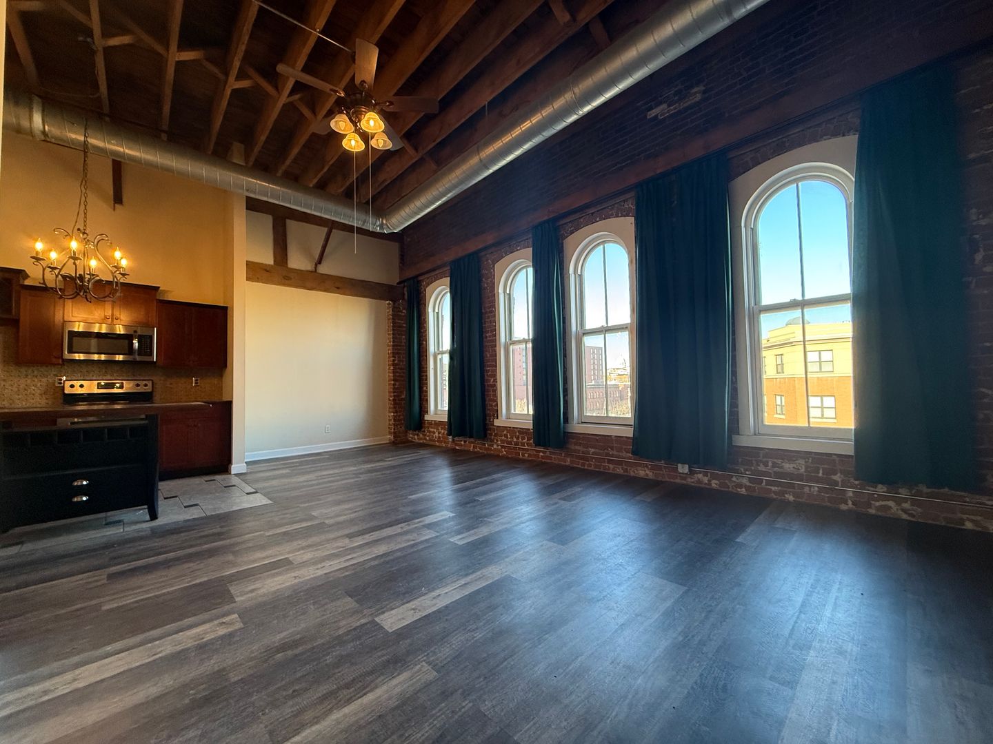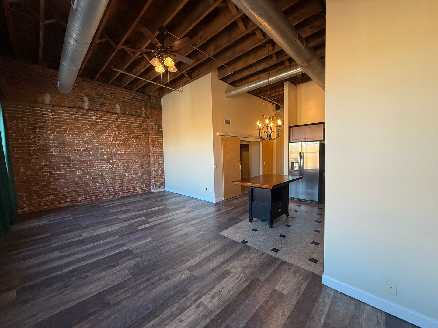 Step inside and be greeted by very tall ceilings, exposed brick walls, and large windows that flood the space with natural light. Elegant chandeliers and ceiling fans add style and comfort, while the open layout makes the home feel expansive and inviting.