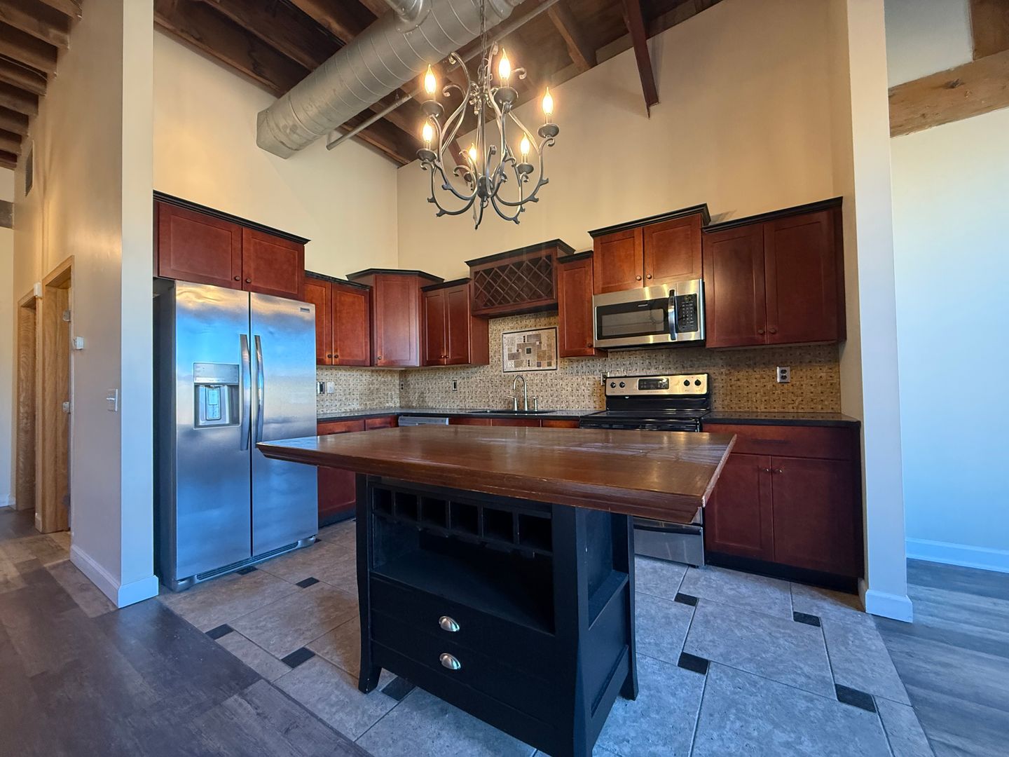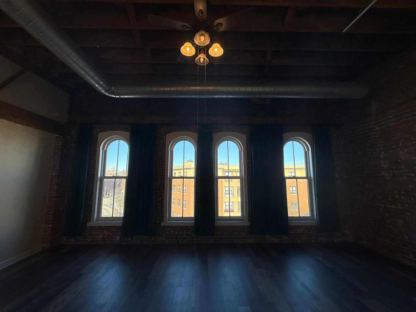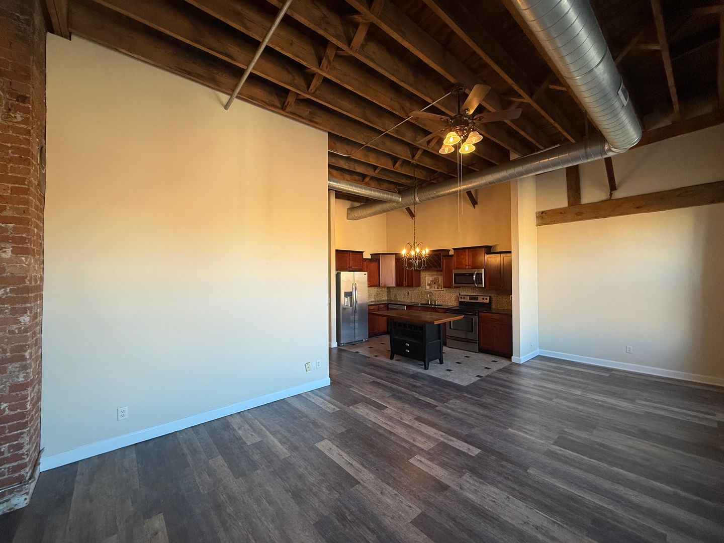 Step inside and be greeted by very tall ceilings, exposed brick walls, and large windows that flood the space with natural light. Elegant chandeliers and ceiling fans add style and comfort, while the open layout makes the home feel expansive and inviting.