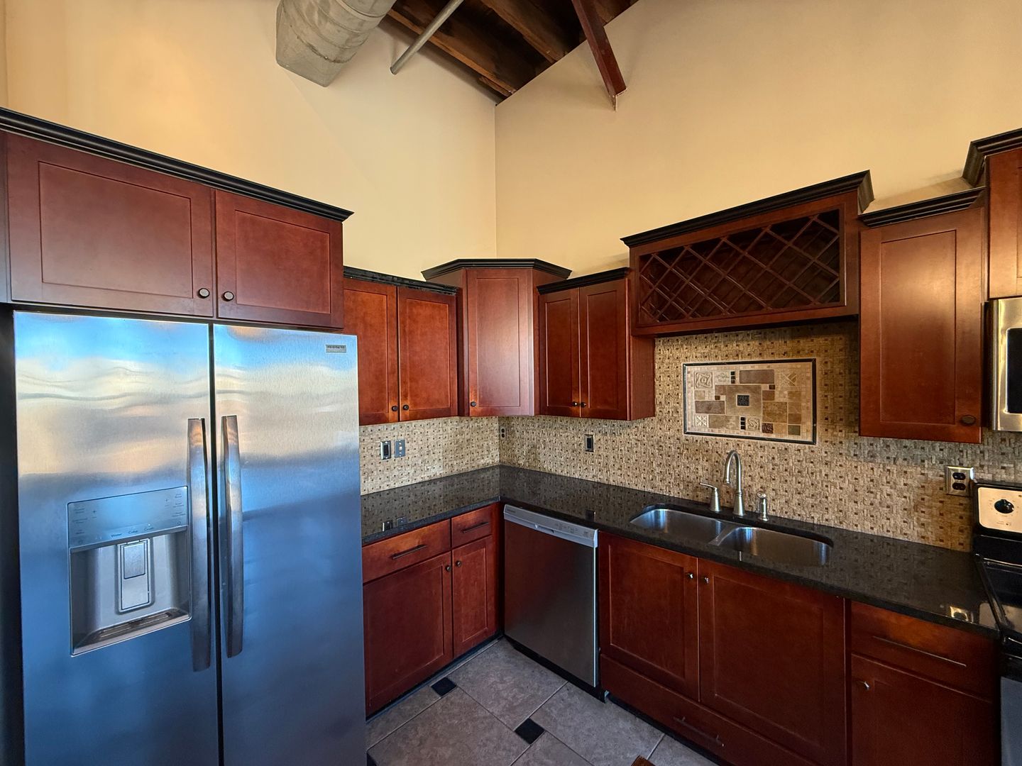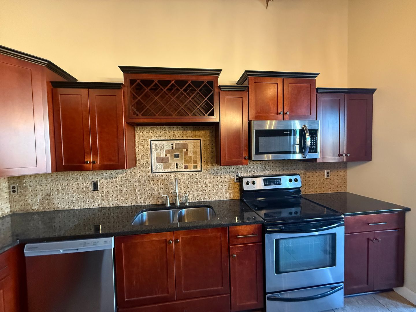 The updated kitchen is designed to impress, featuring mahogany cabinets, granite countertops, stainless steel appliances, a dishwasher, and a large center island perfect for entertaining. A built-in wine rack above the sink, tile backsplash, and oversized kitchen sink complete the space with thoughtful, upscale touches.