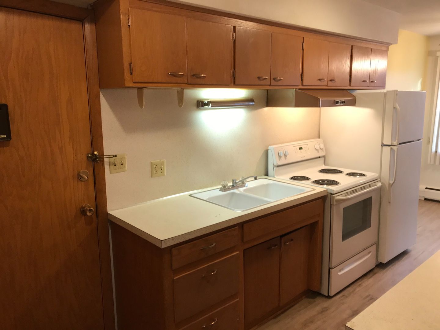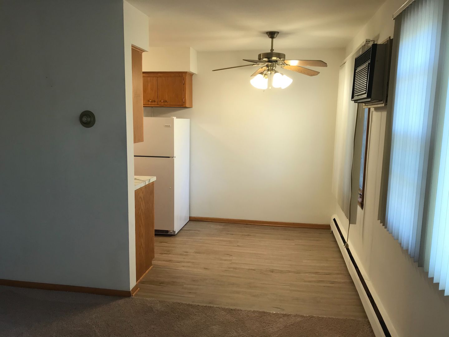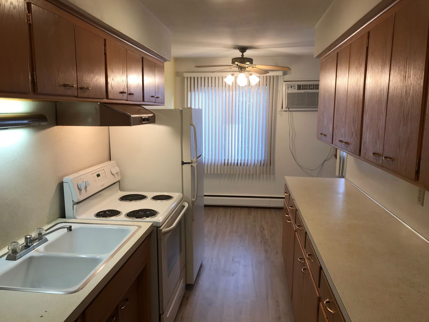 These large 1 bedrooms have a galley style kitchen with tons of cabinet and and countertop space. There is a dining room area off kitchen fit for a small table, a large living room, wall A/C and a bedroom and bathroom to complete unit. Ceiling fans in kitchen and bedroom!!