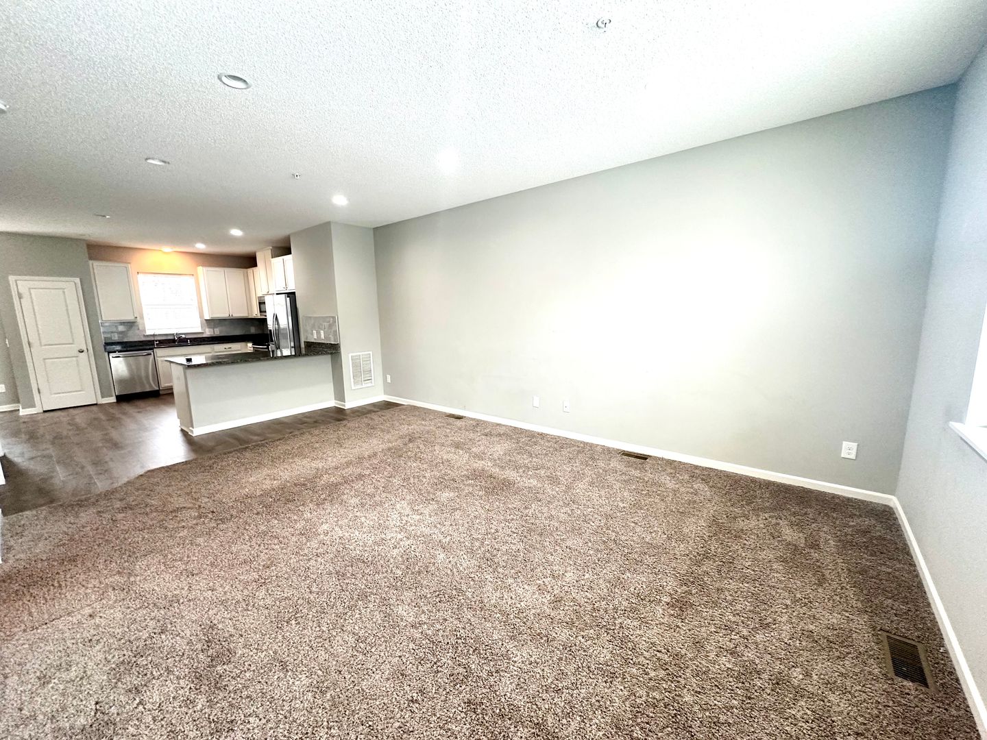 The gourmet kitchen features granite countertops, stainless steel appliances, and ample cabinetry—perfect for everyday living and entertaining alike. Flowing seamlessly into the main living area, this space is designed for both style and functionality.