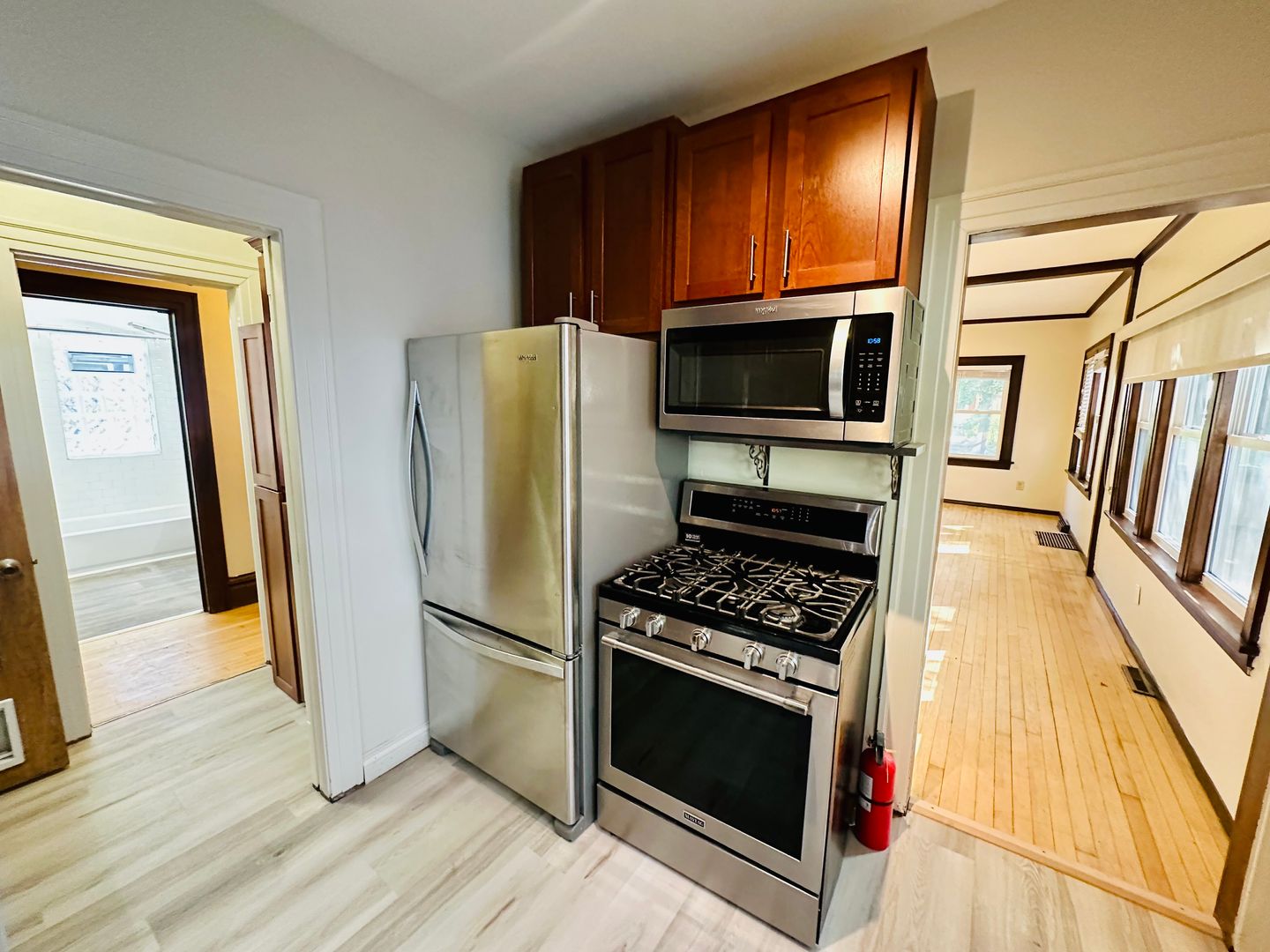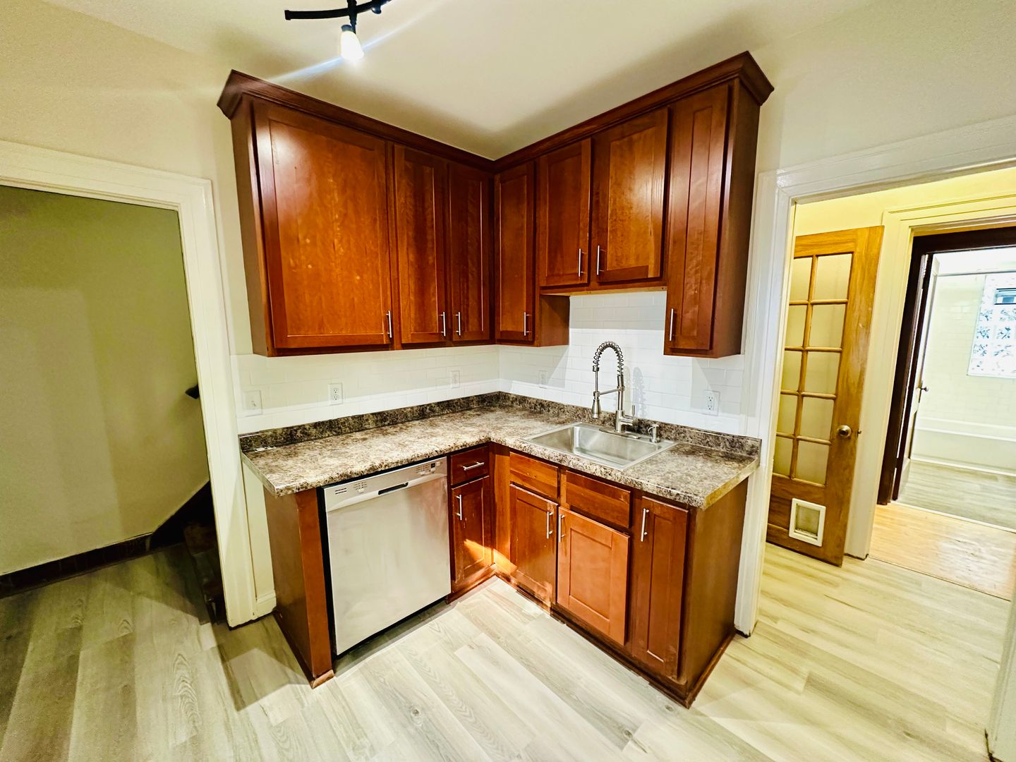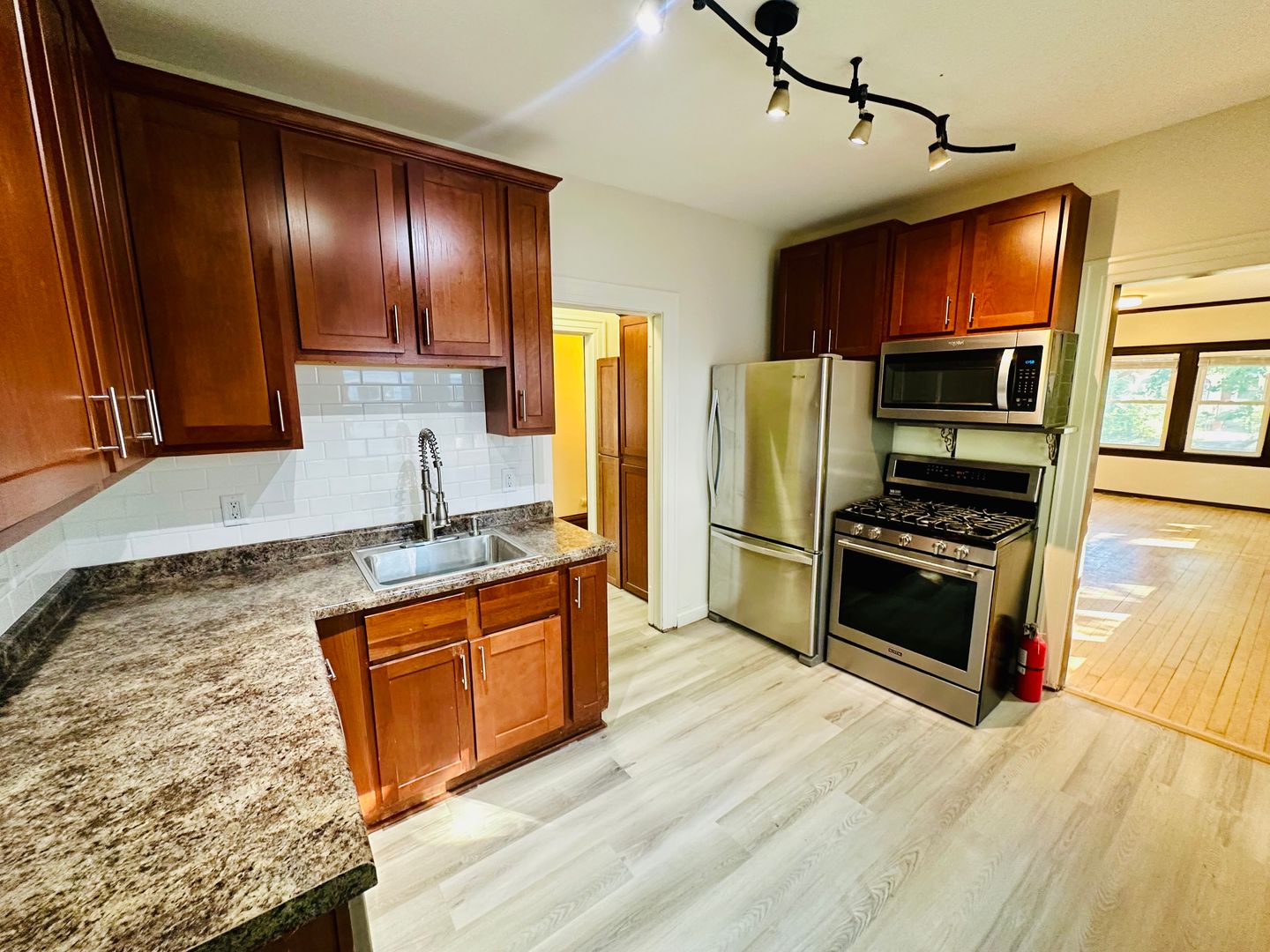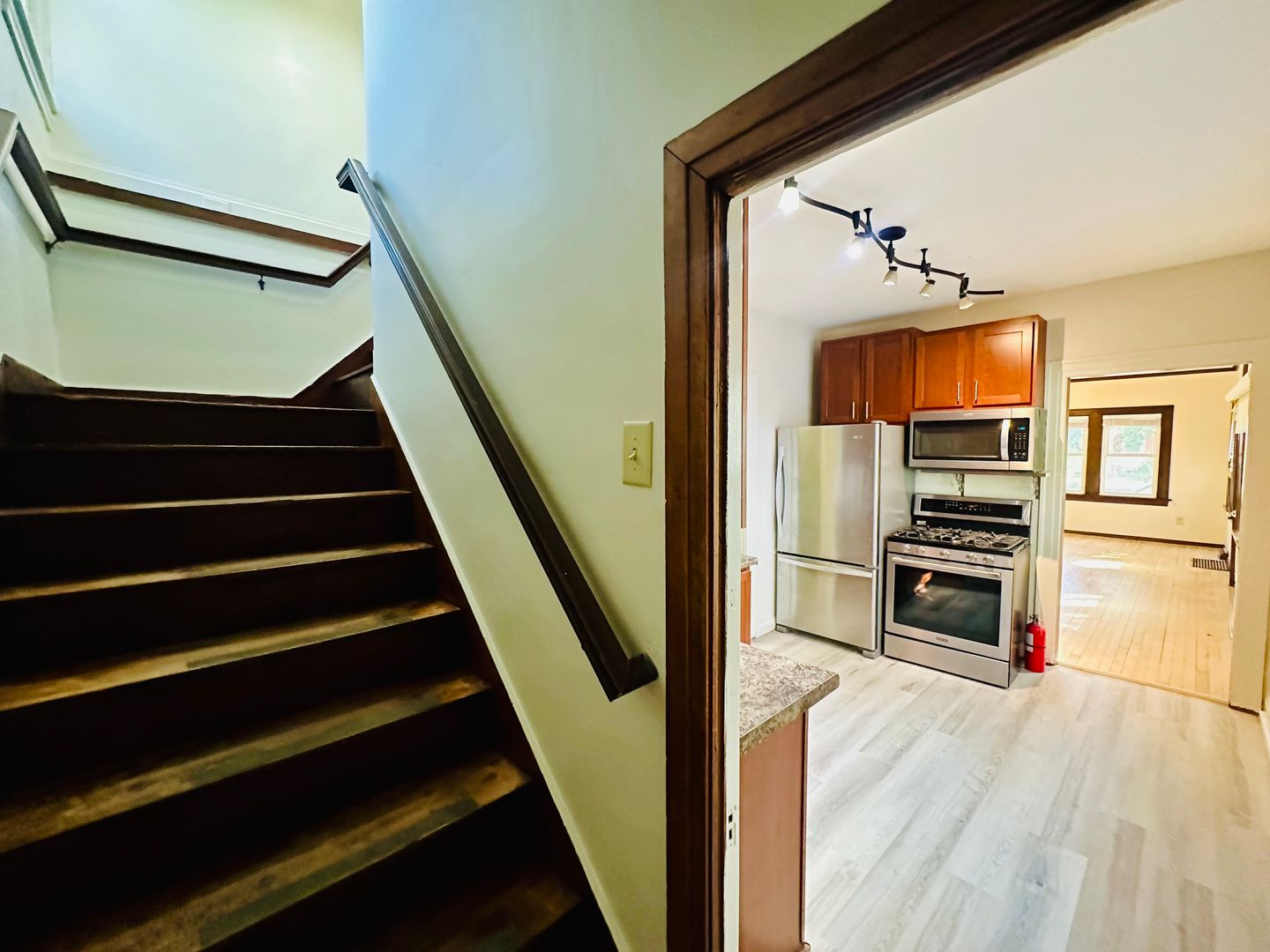 Step inside to a bright, inviting living space featuring hardwood floors, large windows, and a layout that balances character with comfort. The kitchen offers modern amenities and that includes track lighting and stainless steel appliances featuring a GAS stove!
